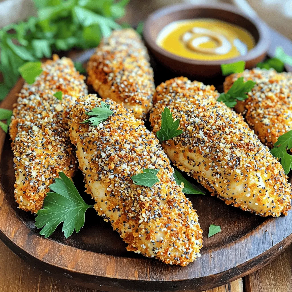 For the breading mixture, you will need two large eggs. Beat them until they are frothy. This egg wash helps the breadcrumbs stick. Next, grab one cup of breadcrumbs. These give the tenders a nice crunch. Then, add three tablespoons of everything bagel seasoning. This mix brings bold flavor to the dish. Don’t forget one teaspoon of garlic powder and one teaspoon of onion powder. These flavors enhance the chicken.