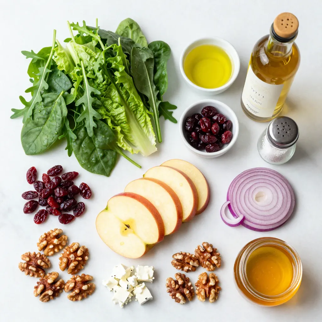 To create a delicious Apple Cranberry Walnut Salad, gather these fresh and vibrant ingredients. The salad base uses a mix of three greens, which gives a nice texture. I love using Honeycrisp or Fuji apples because they are sweet and crunchy. The dried cranberries add a tart flavor that contrasts beautifully with the nuts.