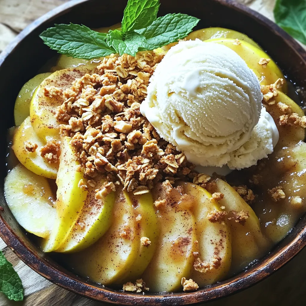 To make the Apple Crisp Skillet with Vanilla Ice Cream, gather these simple ingredients: - 4 large apples (Granny Smith or Honeycrisp) - 1 cup rolled oats - 1/2 cup brown sugar - 1/2 cup all-purpose flour - 1/3 cup unsalted butter (melted) - 1 teaspoon ground cinnamon - 1/2 teaspoon ground nutmeg - 1/4 teaspoon salt - 1 teaspoon vanilla extract - 1 cup chopped nuts (walnuts or pecans) - Creamy vanilla ice cream for serving Using fresh apples is key to great flavor. Granny Smith apples bring a nice tartness. Honeycrisp apples add a sweet crunch. The mix of oats, brown sugar, and nuts creates a perfect topping. The butter helps bind it all together and adds richness. Vanilla extract enhances the dish with a warm aroma. Chopped nuts give a delightful crunch. You can choose walnuts or pecans for added flavor. Last but not least, creamy vanilla ice cream makes this dessert special. It melts beautifully over the warm crisp, adding a cool contrast. Now that you have the ingredients, you’re ready to create a warm, cozy dessert that everyone will love. - Preheating the Oven First, you need to preheat your oven to 350°F (175°C). This step is key for even baking. - Preparing the Skillet Next, take a large, oven-safe skillet. Lightly grease it with non-stick spray. This makes cleanup much easier. - Coating the Apples In a bowl, combine your sliced apples with ground cinnamon, nutmeg, salt, and vanilla extract. Toss well to coat all the apple slices. This adds great flavor to the apples. - Combining Dry Ingredients In another bowl, mix the rolled oats, brown sugar, flour, and chopped nuts. Stir these dry ingredients until they blend well together. - Adding Melted Butter Now, pour melted butter over the oat mixture. Use a fork or your fingers to mix until it becomes crumbly. This topping will give your crisp a nice texture. - Arranging in Skillet Spread the apple mixture evenly in the greased skillet. Ensure the apples lie flat for even cooking. - Baking Time and Temperature Bake the skillet in your preheated oven for about 30-35 minutes. Look for the apples to soften and the topping to turn golden brown. - Cooling Period for Serving Once baked, remove the skillet from the oven. Let it cool for about 10 minutes. This cooling time helps the crisp set, making it easier to serve. When you pick apples for this dish, go for Granny Smith or Honeycrisp. These apples give a nice sweet and tart flavor. They hold their shape well, so they won’t turn mushy. Always choose firm apples. Most grocery stores carry these varieties. If you want a sweeter crisp, mix in some Fuji or Gala apples too. This blend adds depth to the taste. To make your topping crumbly, use cold butter. Melted butter helps, but cold gives a better texture. Mix your dry ingredients well. This includes oats, sugar, flour, and nuts. When you add the butter, mix by hand. This keeps the topping from getting too mushy. The goal is to have small clumps that will bake into a crispy layer. Don’t skip the nuts; they add crunch and flavor. Serve your crisp right from the skillet for a rustic look. This adds charm and warmth. Use a large spoon or spatula to scoop out portions. A scoop of vanilla ice cream on top is a must. The warm crisp and cold ice cream make a great pair. For a pop of color, garnish with fresh mint leaves. It makes the dish look even more inviting. For a sweet upgrade, drizzle caramel sauce over the ice cream. This adds richness and a nice touch of sweetness. You can heat the caramel slightly before drizzling. This makes it easier to pour. If you want to impress, sprinkle some sea salt on top. This balances the sweetness and creates a delightful flavor contrast. {{image_4}} You can change the nuts in your crisp. Try walnuts or pecans for a new taste. Each nut adds its own flavor. If you want a nut-free option, skip the nuts. You can use more oats instead. This swap gives the crisp a chewy texture. Adding dried fruits can make your crisp special. Consider raisins, cranberries, or apricots. These fruits add sweetness and chewiness. You can also try spices like ginger or cloves. These spices add warmth and depth. A pinch of nutmeg or a dash of allspice can work wonders too. Serving your crisp is fun and creative. You can scoop individual portions into small bowls. This makes it easy for guests to enjoy. Or, serve it straight from the skillet. This rustic look brings a cozy feel to the table. You could even add whipped cream or a drizzle of caramel for extra flair. - Best Practices for Refrigeration Store any leftover apple crisp in an airtight container. Keep it in the fridge. It stays fresh for up to three days. Make sure it cools to room temperature before sealing it. This helps keep it from getting soggy. - Reheating Tips To reheat, place your apple crisp in an oven-safe dish. Heat it at 350°F (175°C) for about 15 minutes. You can also use the microwave. Heat it in 30-second bursts. This way, you warm it without overcooking it. - How to Freeze Apple Crisp To freeze, let the apple crisp cool completely. Place it in a freezer-safe container. Wrap it tightly in plastic wrap and then foil. This helps prevent freezer burn. It can last up to three months in the freezer. - Thawing and Reheating When you want to enjoy your frozen apple crisp, take it out of the freezer. Let it thaw in the fridge overnight. Once thawed, reheat it as mentioned above for the best taste. Enjoy every bite of this delicious treat! Yes, you can make this recipe gluten-free. Just swap out the all-purpose flour for gluten-free flour. Use certified gluten-free oats as well. This way, you can enjoy the apple crisp without gluten. Creamy vanilla ice cream is the classic choice. Its rich flavor complements the warm apples and spices. You might also try caramel or cinnamon ice cream for extra flavor. Each adds a lovely twist to your dessert. Look for a golden brown topping and soft apples. The crisp should bubble slightly around the edges. If the topping is golden