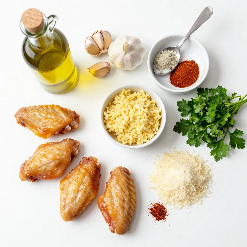 To make Baked Garlic Parmesan Chicken Wings, you need simple, fresh ingredients. Start with two pounds of chicken wings. I prefer using whole wings for the best flavor.