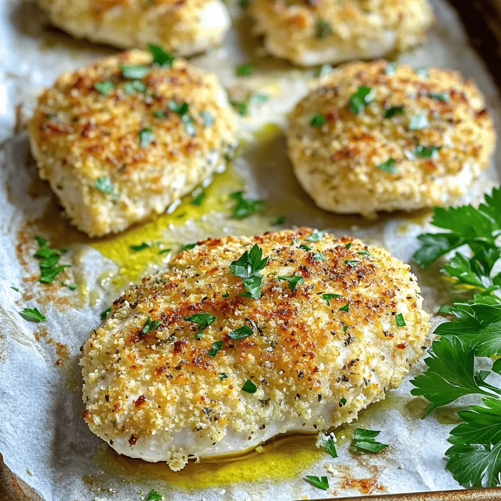 ![- 4 boneless, skinless chicken breasts - 1 cup finely grated Parmesan cheese - 1 cup panko breadcrumbs - 2 teaspoons garlic powder - 1 teaspoon onion powder - 1 teaspoon dried Italian herbs - Salt and pepper to taste - 2 large eggs - 2 tablespoons olive oil - 1 tablespoon fresh parsley (for garnish) This dish starts with simple, fresh ingredients. The chicken breasts are the star, offering lean protein. The Parmesan cheese gives a rich, savory flavor. I love panko breadcrumbs for their crunch. They make the crust crispy and delightful. For seasoning, I use garlic and onion powders. They add depth to the chicken. Dried Italian herbs bring a nice touch of flavor. Don't forget salt and pepper for balance. The breading mixture includes eggs and olive oil. The eggs help the coating stick well. Olive oil adds richness. Fresh parsley is for garnish. It brightens up the dish and adds color. You can find the full recipe in the article for more details. Each ingredient plays an important role in making this dish a winner. - Preheat your oven to 400°F (200°C). - Line a baking sheet with parchment paper or grease it with olive oil. - Combine 1 cup of finely grated Parmesan cheese, 1 cup of panko breadcrumbs, and the seasonings. You can use 2 teaspoons of garlic powder, 1 teaspoon of onion powder, and 1 teaspoon of dried Italian herbs. Add salt and pepper to taste. Mix everything well in a bowl and set aside. - Take 4 boneless, skinless chicken breasts. Dip each breast into the egg mixture, then coat it in the breadcrumb mix. Make sure to cover it completely. Arrange the coated chicken on the baking sheet, leaving space between each piece. - Drizzle olive oil (2 tablespoons) over the coated chicken for added flavor and crispiness. - Bake the chicken for 25-30 minutes. It is ready when it turns golden and reaches an internal temperature of 165°F (75°C). You can find the full recipe to follow along while you cook. To get that amazing crispiness, you need an even coating. Make sure to press the breadcrumb mixture onto the chicken well. This helps the crust stick. Drizzle a little extra olive oil on top before baking. This oil adds a great crunch and helps the chicken brown nicely. Want to kick up the taste? Try adding different spices to the breadcrumb mix. You can mix in paprika for a smoky flavor or some crushed black pepper for a bit of heat. Fresh herbs like thyme or rosemary can also add a nice touch. Experiment until you find your favorite blend! This dish pairs well with lemon wedges. Squeeze some lemon juice over the chicken for brightness. A fresh salad is also a great side. It balances the meal and adds crunch. Try a simple green salad with a light vinaigrette to round out your plate! For the full recipe, check out the [Full Recipe]. {{image_4}} You can make this dish even more delicious by adding cheese. Try mixing in shredded mozzarella for a cheesy twist. This extra layer of gooey goodness makes every bite special. You can also use different types of cheese. Parmesan pairs well with cheddar, gouda, or even pepper jack. Each choice brings a new flavor to the table. For those who like a kick, add crushed red pepper flakes to the breadcrumb mix. This small change can bring big heat. Adjust the amount to suit your taste. Just a pinch can make your chicken sing with flavor. If you want a low-carb version, swap panko for almond flour. Almond flour gives you a nice crunch without the carbs. This option is great for anyone watching their carbs. It keeps the dish light while still being tasty. For the Full Recipe, you’ll find all the details you need to make this meal shine. Store leftovers in an airtight container in the fridge for up to 3 days. This keeps the chicken fresh and safe to eat. When ready to enjoy, just take it out and reheat. You can freeze the breaded chicken before baking for up to 2 months. This option is great for meal prep. Just coat the chicken and place it in a freezer-safe container. When you are ready to cook, bake it straight from the freezer. Reheat in the oven to maintain crispiness rather than using the microwave. Preheat your oven to 350°F (175°C) and bake for about 10-15 minutes. This way, your chicken will stay crunchy and delicious. Enjoy it as if it was freshly made! Yes, chicken thighs can be used for more flavor and moisture. Chicken thighs are juicier than breasts. They provide a rich taste that pairs well with the crispy coating. You can follow the same steps in the recipe. Just adjust the baking time if needed. Serve with pasta, steamed vegetables, or a simple green salad. Pasta with olive oil and garlic makes a great side. Steamed broccoli or green beans add color and nutrients. A light salad with lemon dressing balances the meal perfectly. These options make dinner fun and flavorful! Reduce ingredient quantities accordingly while maintaining ratios. For example, if you need two servings, simply cut the chicken and other ingredients in half. This keeps the flavors balanced and the dish just as tasty. You can easily scale it up or down based on your needs. This post outlined how to make Baked Parmesan Crusted Chicken, from ingredients to storage tips. We covered key steps, including creating a crispy coating and baking methods. To achieve perfect results, remember to coat evenly and explore flavor options. Enjoy this dish with sides like pasta or salad. With easy adjustments for servings, this recipe fits any table. Try it out and savor every bite!](https://dishtreats.com/wp-content/uploads/2025/07/ab4c9608-7523-42b9-8dc2-3e25f574410b-300x300.webp)