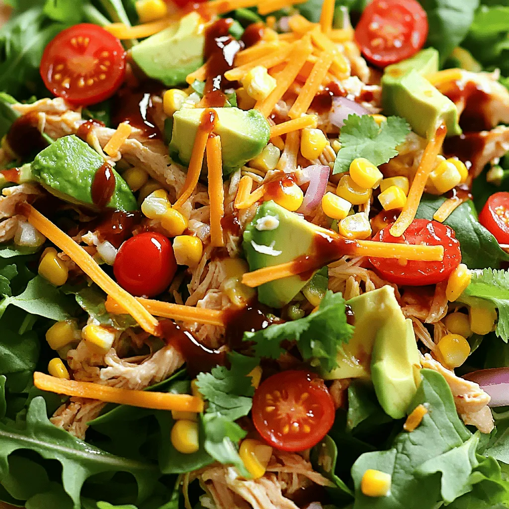 - 2 cups cooked chicken, shredded - 4 cups mixed salad greens - 1 cup cherry tomatoes - 1 cup corn - 1 ripe avocado - 1/2 cup red onion - 1 cup shredded cheddar cheese - 1/2 cup ranch dressing - BBQ sauce - Salt and freshly ground black pepper - Crispy tortilla strips, fresh cilantro leaves When making BBQ Ranch Chicken Salad, start with fresh, quality ingredients. The chicken brings protein and heartiness. I love using shredded chicken that is moist and flavorful. Mixed salad greens add crunch and color. You can choose your favorites like romaine, arugula, or baby spinach. Cherry tomatoes bring sweetness. Always cut them in half to make them easy to eat. Corn adds a pop of sweetness too, and you can use canned or fresh. I prefer fresh corn when it’s in season for the best taste. The avocado adds creaminess. A ripe avocado makes the salad smooth and rich. Red onion gives a nice bite. Keep it thinly sliced so it does not overpower. Shredded cheddar cheese adds a delightful sharpness, making each bite even tastier. The ranch dressing is creamy and tangy, tying everything together. Pair it with BBQ sauce for a smoky flavor boost. This combo is truly delicious. For seasoning, use salt and freshly ground black pepper. These simple touches really enhance the flavors. Lastly, crispy tortilla strips add a fun crunch. Fresh cilantro leaves not only look great but also add a fresh taste. You can find the full recipe [Full Recipe]. Enjoy mixing these ingredients for a vibrant, tasty salad! - Combine shredded chicken with BBQ sauce. - Use a large bowl for easy mixing. - Season with salt and black pepper to taste. - Mix until the chicken is fully coated. This step is key. The BBQ sauce gives the chicken a sweet and smoky flavor. It makes the salad pop with taste. - Create the salad base with mixed greens. - Spread the greens evenly in a large bowl. - Layer fresh ingredients: tomatoes, corn, avocado, and onion. - Arrange each ingredient for a colorful look. The vibrant colors make the salad appealing. Each bite brings a different taste, making it fun to eat! - Top with BBQ chicken and cheddar cheese. - Spoon the chicken evenly over the fresh veggies. - Drizzle with ranch dressing, adjusting to your liking. - Toss gently with clean hands or tongs to mix. This salad is now ready to impress! The creamy ranch dressing and savory chicken blend perfectly. Check the [Full Recipe] for more tips! To make your BBQ Ranch Chicken Salad shine, adjust the ranch dressing to your taste. If you love creamy flavors, add more dressing. For a lighter touch, use less. This lets you control how rich the salad feels. Make sure all ingredients mix well. This way, each bite has a bit of everything. An even spread of chicken, veggies, and cheese creates balance. For a lovely presentation, serve the salad in individual bowls or on a large platter. This makes it easy for everyone to take their share. Add some cilantro leaves and crispy tortilla strips on top. These toppings not only look great but also add flavor and crunch. A colorful display of greens and toppings makes the salad more appealing. Feel free to experiment with different seasonings. A dash of chili powder can add a nice kick. You might also try garlic powder or smoked paprika for depth. Also, think about adding extra ingredients for more variety. Black beans, diced peppers, or even fresh corn can bring new tastes. Each addition offers a chance to create your perfect salad blend. For more details on making this delicious salad, check out the Full Recipe. {{image_4}} You can easily change the protein in this salad. If you want a different taste, use pulled pork or tofu instead of chicken. Both options add great flavor. For a seafood twist, grilled shrimp works well. The shrimp adds a nice, light touch to the salad. While ranch dressing is a favorite, you can swap it out. Blue cheese dressing gives a strong flavor. A vinaigrette adds a tangy kick that brightens the salad. You can also make your own dressing blends. Mix yogurt with herbs for a fresh taste. Don't be afraid to add more veggies. Bell peppers, cucumbers, and radishes give a nice crunch. You can also roast vegetables like zucchini or carrots. Roasting adds a warm, rich taste that contrasts nicely with the cool salad. For a full recipe, check out the BBQ Ranch Chicken Salad with a Crunchy Twist. Store your BBQ Ranch Chicken Salad in an airtight container. This keeps it fresh and tasty. For best results, eat it within 2-3 days. The longer it sits, the soggier it may get. If you want to freeze some, consider freezing the chicken separately. This helps keep the chicken tasty when you eat it later. Avoid freezing the salad with dressing. The dressing makes the greens soggy, and nobody likes that! To refresh your leftovers, toss them with fresh greens. This adds crunch and makes it feel new again. If you want to reheat the BBQ chicken, do it separately. This keeps it warm without making the salad wilt. To make BBQ Ranch Chicken Salad, follow these simple steps: 1. Prepare the BBQ Chicken: Mix shredded chicken with BBQ sauce in a big bowl. Add salt and black pepper. Stir until the chicken is well coated. 2. Build the Salad Base: In another large bowl, spread the mixed greens evenly. This is your salad's base. 3. Layer Fresh Ingredients: Add halved cherry tomatoes, corn, diced avocado, and sliced red onion on top of the greens. This creates a colorful layer. 4. Top with BBQ Chicken: Spoon the BBQ chicken evenly over the fresh layers. This ensures every bite has flavor. 5. Add Creamy Cheese: Sprinkle shredded cheddar cheese over the salad. Let it melt slightly into the warm chicken. 6. Drizzle with Dressing: Pour ranch dressing over the salad. Adjust the amount to fit your taste. 7. Toss Gently: Use clean hands or tongs to mix everything. Make sure the ranch dressing coats all the ingredients. 8. Taste Test: Before serving, taste the salad. Add more salt or black pepper if needed. 9. Add Crunch and Garnish: Top w