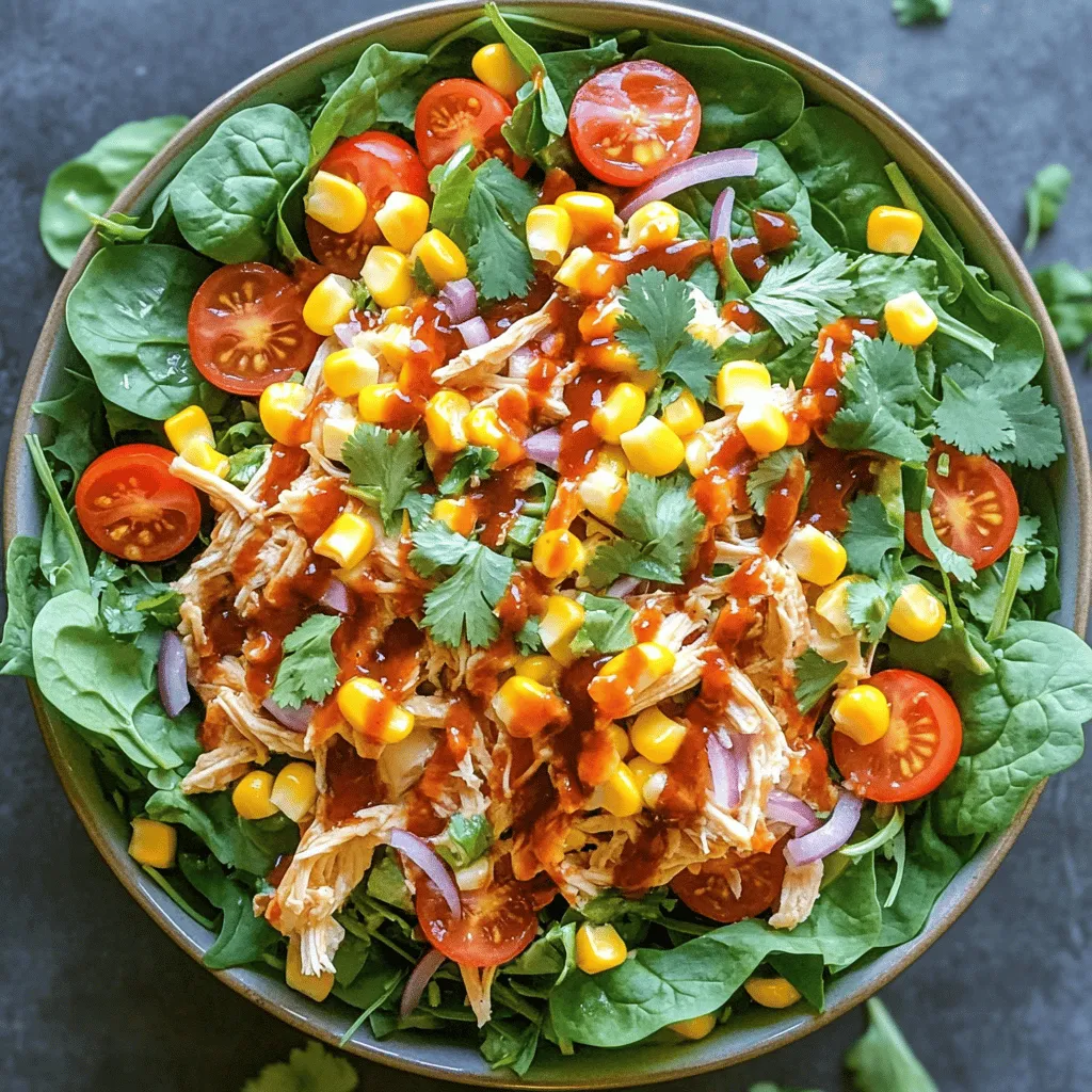 - 2 cups cooked chicken breast, shredded - 4 cups mixed greens (spinach, romaine, and arugula) - 1 cup cherry tomatoes, halved - 1 cup corn kernels (fresh or frozen) - 1/2 cup red onion, thinly sliced - 1 cup shredded cheddar cheese - 1/2 cup BBQ sauce - 1/2 cup ranch dressing - 1/4 cup fresh cilantro, chopped (optional) - Salt and freshly ground black pepper, to taste For the BBQ Ranch Chicken Salad, the ingredients play a key role. Start with cooked chicken breast, shredded to bite-sized pieces. This chicken brings protein and heartiness. Mixed greens give the salad a fresh crunch. I love to use a mix of spinach, romaine, and arugula. Each green adds its own flavor and texture. Next up are the cherry tomatoes. Halving them allows their juicy sweetness to burst in your mouth. The corn kernels add a nice pop of sweetness, too. You can use fresh corn or frozen corn, which works well. Don't forget the red onion. Thin slices give a sharp bite that balances the salad. And then there's the shredded cheddar cheese. It adds both creaminess and richness that everyone loves. For the dressings, choose your favorite BBQ sauce. The tangy flavors mix well with the ranch dressing. The ranch adds a creamy, tangy kick. Finally, a sprinkle of fresh cilantro can add a burst of flavor, but it’s optional. I like to add salt and black pepper to enhance all the tastes. With these ingredients, you create a colorful and tasty salad that can please any crowd. - Combine shredded chicken with BBQ sauce. - Toss gently to coat. Start by taking your cooked chicken breast and shredding it. I like to use my hands or two forks to shred it into nice, bite-sized pieces. Then, pour the BBQ sauce over the chicken in a large bowl. Mix it well to ensure every piece is coated. This step truly makes the chicken flavorful and juicy. - Layer mixed greens in a large serving bowl. - Distribute BBQ chicken mixture over greens. Now it’s time to build your salad. Grab a large serving bowl and add your mixed greens. I prefer a mix of spinach, romaine, and arugula for a nice texture and taste. Once the greens are ready, take your BBQ chicken mixture and spoon it over the top. Spread it evenly to give you that delicious flavor in every bite. - Arrange cherry tomatoes, corn, and red onion on top. - Sprinkle with cheddar cheese. - Drizzle ranch dressing and season. Next, let’s enhance the salad. Start by adding halved cherry tomatoes, corn kernels, and thinly sliced red onion on top of the chicken. These toppings add great color and crunch. After that, sprinkle a generous amount of shredded cheddar cheese over everything. Then, grab your ranch dressing and drizzle it all over the salad. Finish by seasoning with salt and fresh black pepper to taste. If you like, add chopped cilantro for an extra burst of flavor. Mix it all gently or keep it layered for a beautiful presentation. Enjoy your BBQ Ranch Chicken Salad! You can boost the taste of your BBQ Ranch Chicken Salad with simple tweaks. Start by using homemade BBQ sauce. Making your own sauce lets you pick the flavors you love. You can add more sweetness, heat, or tang as you like. It’s a fun way to be creative! Next, think about the ranch dressing. Adjust the amount to fit your taste. If you love creamy flavors, add more ranch. If you prefer a lighter touch, use less. The goal is to make it just right for you. When serving this salad, presentation can wow your guests. Use a large bowl for sharing. This makes the colorful layers stand out. You can also serve it in individual bowls. This gives each guest a personal touch. For a fun twist, garnish the salad with extra cilantro. A light drizzle of ranch dressing on top adds flair. This makes it look inviting and ready to eat! If you have dietary needs, there are easy swaps. For a gluten-free option, ensure your BBQ sauce and ranch dressing are gluten-free. You can also use lettuce wraps instead of greens for a low-carb meal. To make it dairy-free, swap the cheese for a vegan option. You can also use a dairy-free ranch dressing to keep the creamy taste. These adjustments let everyone enjoy this delicious salad! {{image_4}} You can easily switch up the protein in your BBQ Ranch Chicken Salad. If you want a lighter option, try grilled shrimp. Shrimp adds a nice seafood twist. You can also use tofu for a vegetarian choice. Tofu soaks up flavors well, making it tasty. Lastly, beans are a great option too. Black beans or chickpeas can make the salad filling and nutritious. To boost the flavor, consider adding more ingredients. Avocado brings creaminess and healthy fats. It makes each bite richer. Bell peppers add crunch and color. They come in many shades, so feel free to mix them. If you like heat, jalapeños are perfect. They add a spicy kick that pairs well with BBQ sauce. While ranch dressing is classic, you can explore other options. Blue cheese dressing offers a sharp taste that contrasts nicely with BBQ. A vinaigrette can lighten the dish. It adds tang and freshness, which can be really refreshing. Try different dressings to find your favorite mix. To keep your BBQ Ranch Chicken Salad fresh, store it properly. First, place any leftover salad in a clean container. A glass or plastic container with a tight lid works best. Avoid using metal containers, as they can affect the taste. Make sure to separate the BBQ chicken from the greens if possible. This keeps the salad from getting soggy. When stored well, your salad will stay fresh for about three days in the fridge. After that, the quality declines. You may notice the greens wilting or becoming mushy. For the best taste, eat the salad within this time frame. If you notice any bad smell or color change, throw it away. If you want to enjoy the chicken warm, here are some tips. Place the chicken in a microwave-safe dish. Heat it in short bursts of 30 seconds until hot. Stir between intervals to ensure even heating. Do not reheat the salad itself, as the greens will not hold up well. Inste