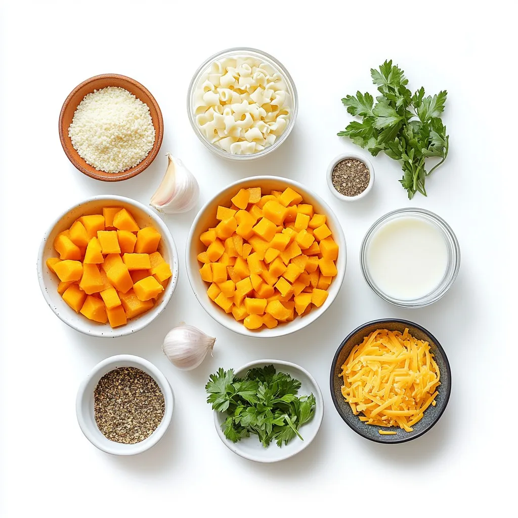 Butternut squash mac and cheese is a dish that warms the heart. The main ingredients create a rich base. Elbow macaroni gives a cozy texture. Butternut squash adds a sweet, creamy element. Olive oil helps sauté the onions and garlic, giving a fragrant touch.