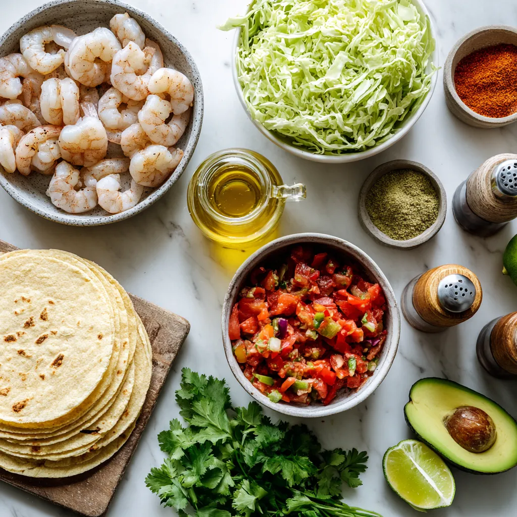 To make these tacos, you need fresh shrimp. I love using large shrimp. They cook fast and taste great. You also need small corn tortillas, which are soft and perfect for wrapping.