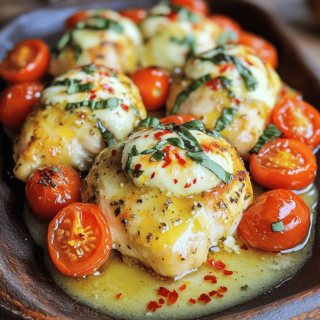 - 4 boneless, skinless chicken breasts - 1 cup cherry tomatoes, halved - 1 cup fresh mozzarella balls, halved - 1/2 cup fresh basil leaves, roughly chopped - 4 cloves garlic, finely minced - 1/2 cup unsalted butter (1 stick) - 2 tablespoons olive oil - 1 teaspoon balsamic vinegar - Salt and pepper to taste - Optional: Red pepper flakes for a spicy touch To make Caprese Garlic Butter Chicken, gather these key ingredients. Start with fresh chicken breasts. They form the main part of this dish. Next, grab some cherry tomatoes, basil, and mozzarella. These give it a fresh and vibrant feel. You need garlic for that rich flavor. Butter is important too. It creates a savory sauce that coats the chicken. Olive oil helps with cooking the chicken perfectly. Balsamic vinegar adds a slight tang. Finally, salt and pepper bring out all the flavors. Optional red pepper flakes give a spicy kick. Using fresh ingredients makes a big difference. They add color and taste to your dish. When you prepare this meal, you will enjoy each bite. 1. Start by seasoning both sides of each chicken breast. Use a good pinch of salt and some cracked pepper. This step adds flavor and makes the dish tasty. 2. Heat a large skillet over medium-high heat and add olive oil. When the oil shimmers, add the chicken breasts. Sear them for about 5-7 minutes on each side. Look for a nice golden-brown color. Check that the chicken reaches an internal temperature of 165°F (74°C). Once done, place the chicken on a plate and set it aside. 1. In the same skillet, lower the heat to medium. Add the unsalted butter and let it melt. Once melted, add the finely minced garlic. Cook it for 1-2 minutes until it smells great and turns golden. 2. Next, toss in the halved cherry tomatoes. Cook them for about 3-4 minutes, stirring often. This helps them soften and release their juices, creating a nice sauce. 1. Now, return the cooked chicken to the skillet. Place it among the tomatoes and spoon the garlic butter over the chicken. This lets the chicken soak up all the wonderful flavors. 2. Scatter the halved mozzarella balls over the chicken. Drizzle balsamic vinegar around the chicken as well. Cover the skillet with a lid and cook for another 2-3 minutes. This helps the mozzarella melt perfectly over the chicken. 1. Once everything looks great, take the skillet off the heat. Sprinkle the freshly chopped basil over the chicken and melted cheese. This adds a fresh touch. 2. If you like a bit of spice, add a pinch of red pepper flakes on top. Enjoy every delicious bite! - Use a meat thermometer to check the chicken’s doneness. Aim for 165°F (74°C) inside. This ensures the chicken stays juicy and safe to eat. - For a golden-brown sear, heat your skillet well before adding the chicken. This helps create a nice crust. Don’t overcrowd the pan. Cook in batches if needed to get that perfect sear. - To boost flavor, try marinating the chicken in olive oil, garlic, and herbs for a few hours before cooking. This adds depth to your dish. - You can swap mozzarella for burrata for a creamier texture. You could also add Parmesan or feta for a different twist. Don’t hesitate to toss in some olives or sun-dried tomatoes for extra zing! {{image_4}} You can switch up the protein in this dish. If you want to use turkey, it works great. Just make sure to adjust the cooking time, as turkey may take a bit longer than chicken. For pork, choose tender cuts like chops or tenderloin. Cook them the same way. If you want a vegetarian dish, try using tofu. Firm tofu holds up well. Cut it into thick slices and follow the same steps. Sear the tofu until golden, then add the garlic butter sauce. It will soak up all those tasty flavors. You can change the taste by adding different herbs. Oregano and thyme are excellent choices. They give a nice earthy flavor that mixes well with garlic and butter. You can add these herbs while you cook the garlic. Incorporating seasonal vegetables is another fun way to mix things up. Try adding zucchini or bell peppers. Just slice them and toss them in with the tomatoes. They will add color and nutrients, making the dish even better. To keep your Caprese Garlic Butter Chicken fresh, follow these steps: - Refrigeration: Place leftovers in an airtight container. They can last for about 3-4 days in the fridge. Always cool the chicken to room temperature before storing. - Freezing: If you want to freeze it, use a freezer-safe container. Wrap the chicken tightly in plastic wrap, then place it in a container. It can last up to 3 months in the freezer. For best results, freeze it without the tomatoes and cheese to keep the texture. When you are ready to enjoy your leftovers, reheating properly is key to keeping your chicken moist. - Best methods: Use the stovetop for the best results. Heat a skillet over medium-low heat. Add a little olive oil or butter. Place the chicken in the skillet and cover it with a lid. It should reheat in about 5-7 minutes. This keeps the chicken juicy and warm. - Using microwave vs. stovetop: If you use the microwave, place the chicken on a microwave-safe plate. Add a splash of chicken broth or water to keep it moist. Cover it with a damp paper towel. Heat it in short bursts, checking every minute until hot. This method may dry out the chicken, so use it as a last resort. To spice up your dish, consider adding red pepper flakes. A pinch goes a long way! You can also try cayenne pepper for more heat. If you love bold flavors, mix in some hot sauce or a dash of chili powder. Adjust the spice level to match your taste. You can always add more, but it’s hard to take it out. Yes, you can use dried herbs. However, fresh herbs bring brighter flavors. If you use dried, cut the amount by one-third. Dried herbs are stronger than fresh. For this recipe, dried basil works well but may not have the same freshness. If you can, go for fresh! Definitely! This dish is great for meal prep. You can cook the chicken ahead and store it in t