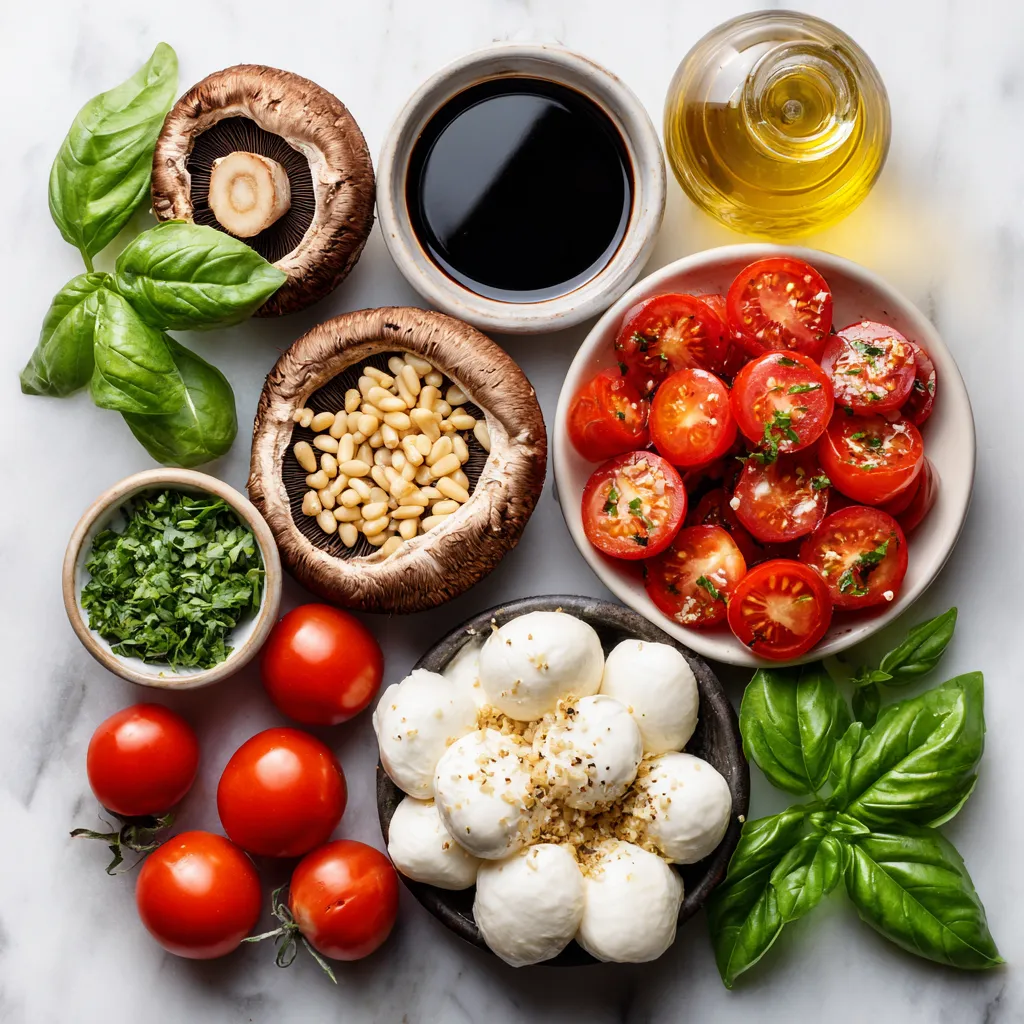 The main ingredients for Caprese stuffed portobellos are simple yet fresh. You start with four large portobello mushrooms. These mushrooms are meaty and hold the filling well. Next, you need two cups of cherry tomatoes. Halve them for a burst of flavor. Then, grab a cup of fresh mozzarella balls, also known as bocconcini. These tiny balls melt beautifully. Lastly, have a cup of fresh basil leaves ready. Chop most of them, but keep a few whole for garnish.