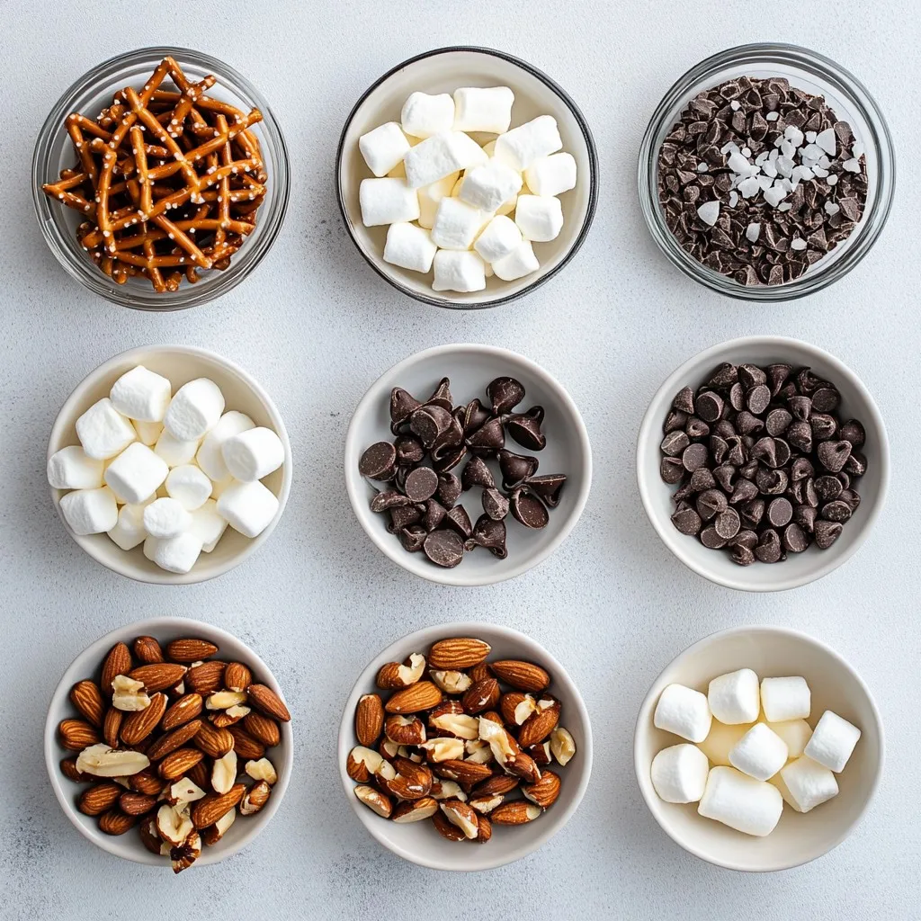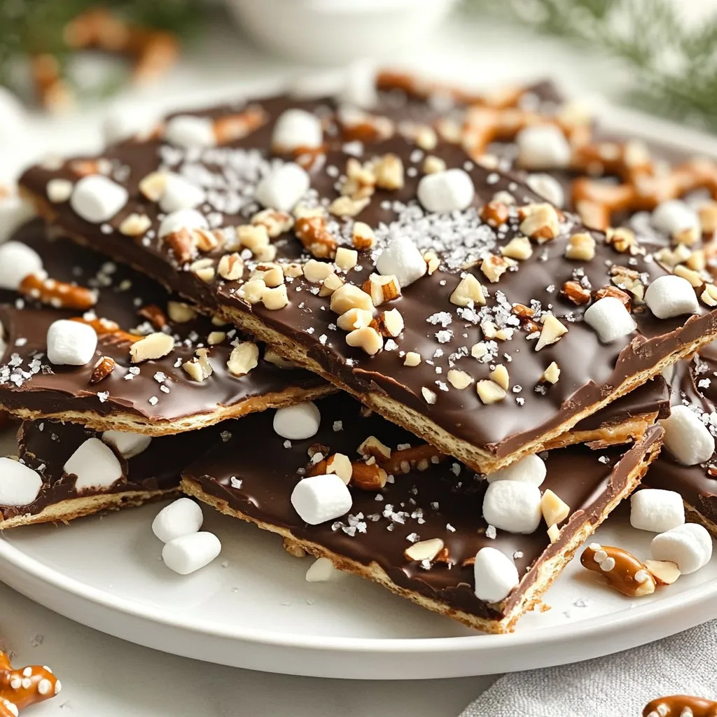 Gathering the right ingredients is key to making chocolate covered pretzel bark. I love using coarsely broken pretzels. They add a great crunch and salty flavor. Dark chocolate chips bring rich taste, while white chocolate adds sweetness. You can choose any crushed nuts you enjoy. They give a nice texture. Mini marshmallows can make it fun, but they’re not a must.