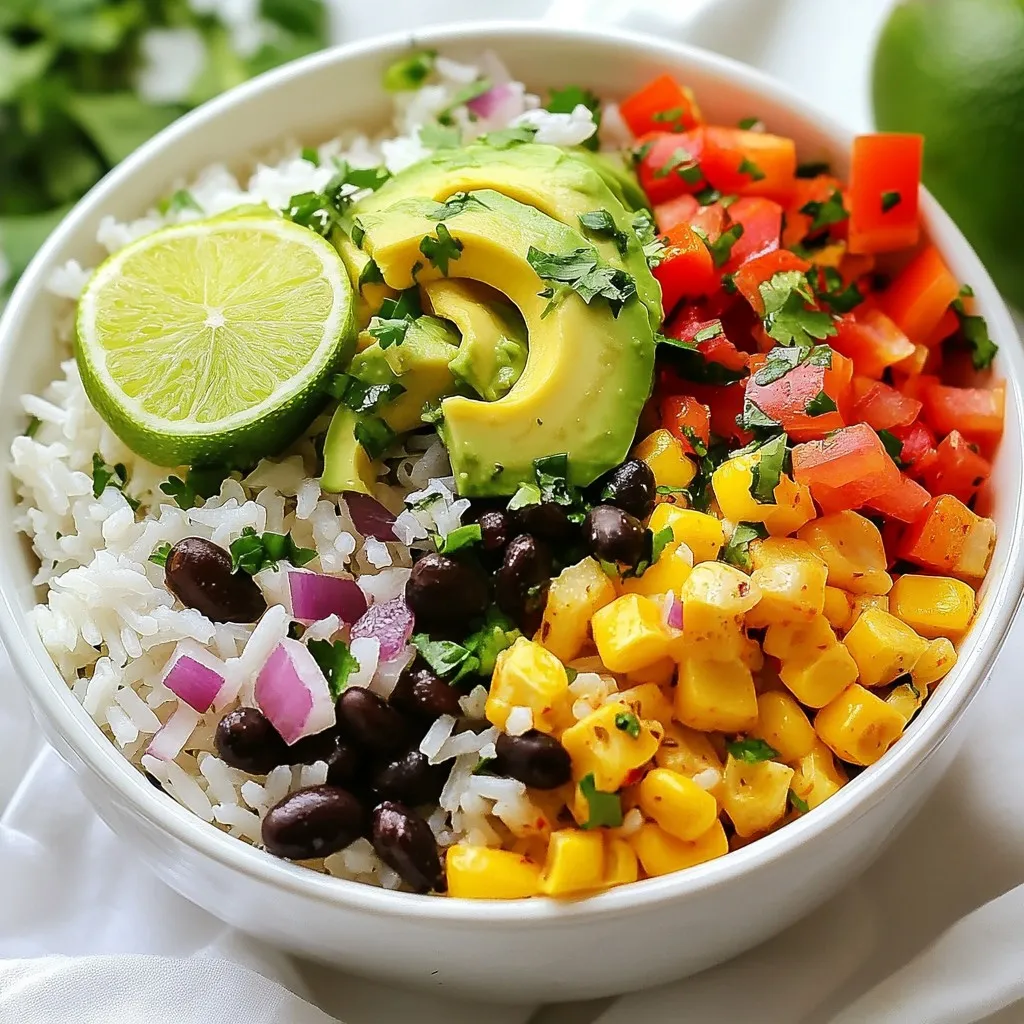 - To assemble your bowls, start with a generous serving of the cilantro lime rice as the base. Layer over the black beans, the sautéed red bell pepper and corn mixture, sliced avocado, and thinly sliced red onion.