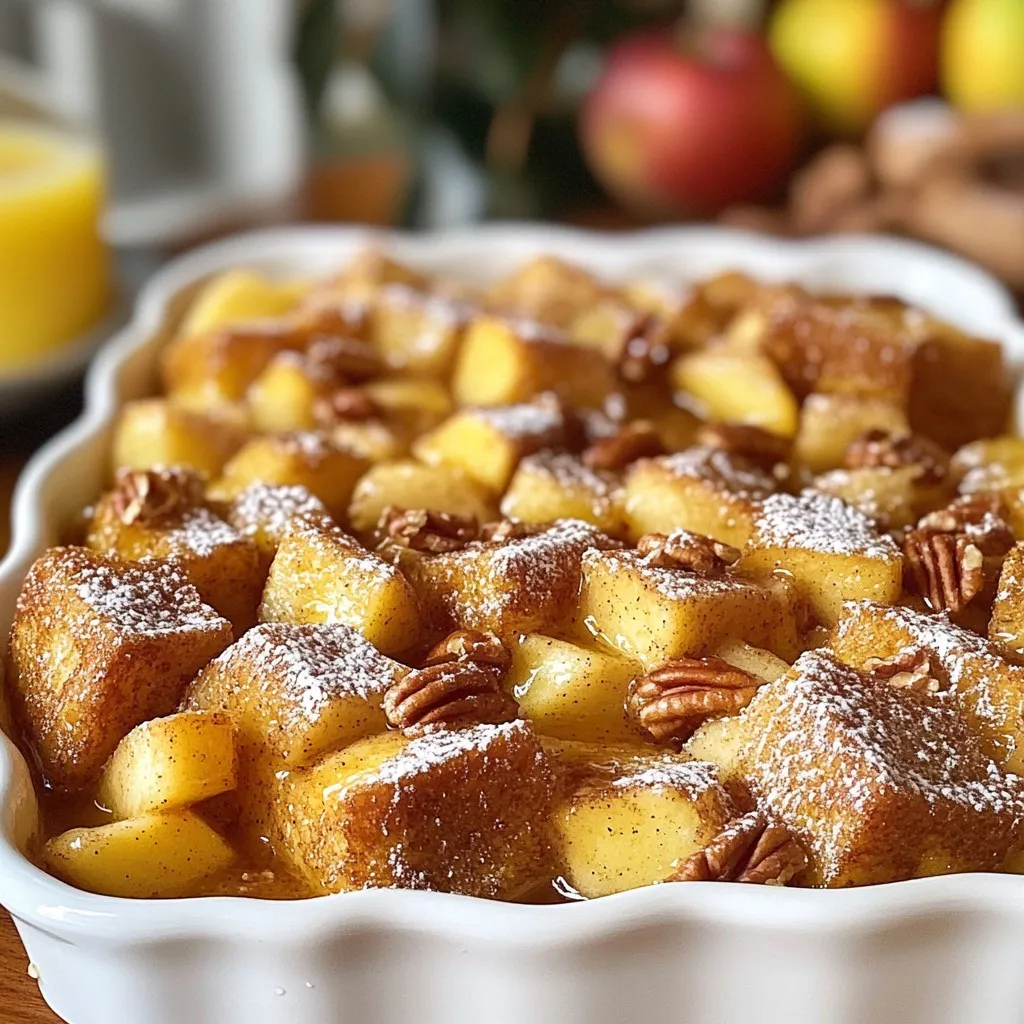 Each ingredient plays a special role in creating a warm and cozy dish. The French bread gives the bake its soft texture. Eggs and milk bind everything together. Sugar adds sweetness, while cinnamon and nutmeg bring warmth and spice. The apples add a fresh crunch, and pecans give an extra layer of flavor. Maple syrup drizzled on top makes it even more delightful. Finally, a dusting of powdered sugar can make your dish look fancy.