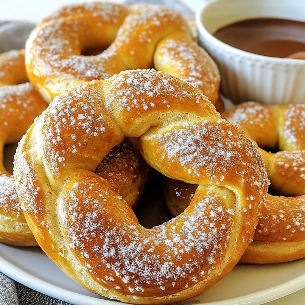 - 2 ¼ teaspoons active dry yeast - 1 cup warm water (110°F/43°C) - 2 tablespoons granulated sugar - 2 ½ cups all-purpose flour - 1 teaspoon salt - 2 tablespoons unsalted butter, melted - Baking soda (for boiling) - 1/4 cup unsalted butter, melted (for brushing) - 1/2 cup granulated sugar (for coating) - 2 teaspoons ground cinnamon To make cinnamon sugar soft pretzels, gather these ingredients first. The active dry yeast helps the dough rise. Warm water activates the yeast and gives it life. Granulated sugar sweetens the dough. All-purpose flour gives structure and chew. Salt enhances the flavor, while melted unsalted butter adds richness. Baking soda is key for boiling. It gives pretzels their unique texture. You will need extra melted butter for brushing on top. The cinnamon and sugar mix creates the sweet coating. These ingredients come together to create a treat that is both soft and flavorful. Each one plays an important role in making the pretzels taste amazing. {{ingredient_image_2}} First, you need to wake up the yeast. In a medium bowl, mix 2 ¼ teaspoons of active dry yeast with 1 cup of warm water and 2 tablespoons of granulated sugar. Stir it gently. Let it sit for about 5 minutes. You will know it's ready when the mixture looks frothy. This means the yeast is active and ready to work. In a large bowl, whisk together 2 ½ cups of all-purpose flour and 1 teaspoon of salt. Next, pour in the melted butter and the yeast mixture. Mix everything well until you have a shaggy dough. After that, transfer the dough to a floured surface. Knead it for about 5 to 7 minutes. You want the dough to feel smooth and elastic. If the dough sticks, sprinkle a little more flour as needed. Now, shape the dough into a ball. Put it in a greased bowl and cover it with a damp cloth. Place the bowl in a warm area. Let it rise for about 1 hour or until the dough has doubled in size. This step is important as the yeast helps the dough become fluffy. While the dough rises, preheat your oven to 425°F (220°C). Line two baking sheets with parchment paper for easy cleanup. Fill a large pot with about 6 cups of water and bring it to a gentle boil. Add ½ cup of baking soda to the boiling water. It will bubble up, which is normal. When the dough has risen, punch it down and divide it into 8 equal pieces. Roll each piece into a long rope, about 24 inches long. Twist the ends to shape each rope into a classic pretzel form. Carefully drop the pretzels into boiling water, one at a time. Cook them for about 30 seconds, then use a slotted spoon to remove them. Let the excess water drip off before placing them on the baking sheets. In a small bowl, mix ½ cup of granulated sugar with 2 teaspoons of ground cinnamon. Brush the top of each pretzel with melted butter. Then sprinkle the cinnamon sugar mixture generously over each pretzel. Bake the pretzels in the preheated oven for 12 to 15 minutes. They should turn golden brown and smell amazing. Enjoy the warm, sweet treats right from the oven! To get the best soft pretzels, kneading is key. Knead the dough for about 5 to 7 minutes. This builds gluten, which makes the pretzels chewy and soft. If the dough sticks to your hands, add a little flour. Be sure to feel the dough; it should be smooth and elastic. Yeast activation is also important. Mix the yeast with warm water and sugar. Wait until the mixture is frothy, about 5 minutes. This shows the yeast is alive and ready to help your pretzels rise. You can adjust the spice mix for your cinnamon sugar. If you love a strong taste, add more cinnamon. For a twist, try adding nutmeg or even vanilla to the mix. Alternative toppings can take your pretzels to new heights. You could sprinkle sea salt or even Parmesan cheese for a savory treat. Get creative with what you have on hand! Pair your warm pretzels with fun dips. Melted cheese or a sweet chocolate sauce works well. You can even serve them with a creamy ranch or mustard dip. For a beautiful presentation, use a rustic wooden board. Dust extra cinnamon sugar on top for a nice touch. You could also add a small bowl of dip on the side. This will make your pretzels look exciting and inviting! Pro Tips Yeast Activation: Ensure the water temperature is around 110°F (43°C) to properly activate the yeast without killing it. The mixture should become frothy within 5 minutes. Dough Consistency: When kneading, aim for a dough that is smooth and elastic. If it feels sticky, gradually add more flour, but avoid over-flouring. Boiling Technique: Adding baking soda to the boiling water gives the pretzels their characteristic color and flavor. Be cautious as it creates a strong reaction. Cinnamon Sugar Coating: For an extra touch, brush the pretzels with melted butter immediately after boiling, then coat them generously in the cinnamon sugar mixture for maximum flavor. {{image_4}} You can easily switch up the flavors of your soft pretzels. One fun idea is to add chocolate chips. Just mix them into the dough after you knead it. The warm dough will melt the chips slightly, creating a gooey treat. You can also add nuts for a crunchy twist. Chopped pecans or almonds work well. If you prefer savory pretzels, try cheese or herbs. Grated cheese, like cheddar or mozzarella, can be mixed into the dough. You could also sprinkle herbs like rosemary or thyme on top before baking. This creates a great contrast to the sweet cinnamon sugar. If you need gluten-free pretzels, you can make some easy swaps. Use gluten-free all-purpose flour instead of regular flour. Brands like Bob's Red Mill or King Arthur Flour have great options. You might also add a bit of xanthan gum to help with texture. To achieve the right softness, make sure to knead the dough well. Gluten-free dough can be a bit different, so watch for tackiness. If it feels too sticky, add more gluten-free flour little by little. These tips will help your pretzels turn out soft and chewy, just like the classic version. To keep your pretzels f