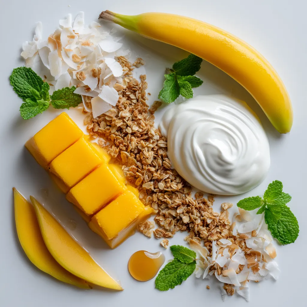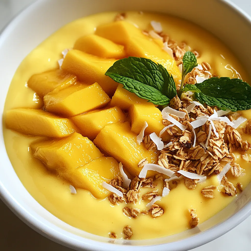 - For a beautiful finish, artfully arrange your toppings: sprinkle granola, add shredded coconut, and artistically place fresh mango slices and mint leaves on top, creating an inviting and colorful display.