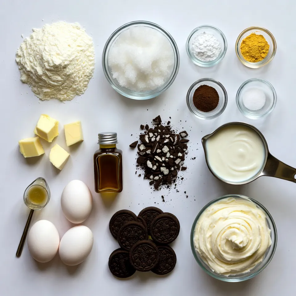 To make cookies and cream stuffed cupcakes, gather these ingredients. All-purpose flour gives structure. Granulated sugar adds sweetness. Baking powder and baking soda help the cupcakes rise. Salt balances flavors.