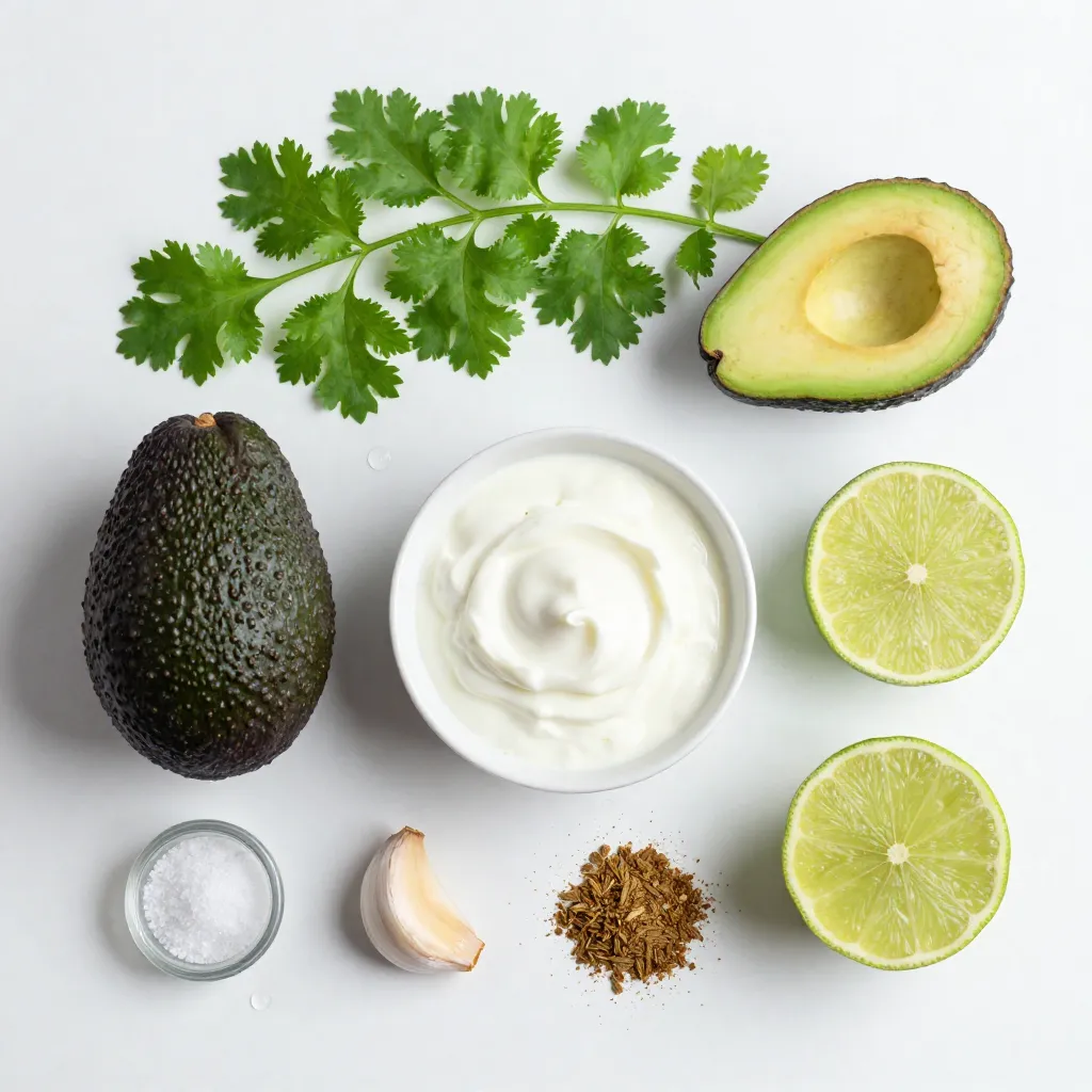 - To the avocado, add the fresh cilantro leaves, Greek yogurt, freshly squeezed lime juice, minced garlic, and ground cumin.