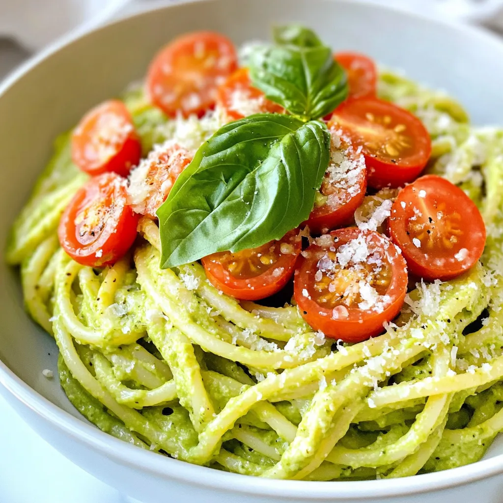 This creamy avocado pasta pairs well with proteins. Grilled chicken or sautéed shrimp add a nice touch of protein. They make the meal more filling and delicious. You can serve this pasta with fresh salads or warm bread. A light salad adds color and freshness, while crusty bread is perfect for scooping up that creamy sauce. Enjoy your meal!