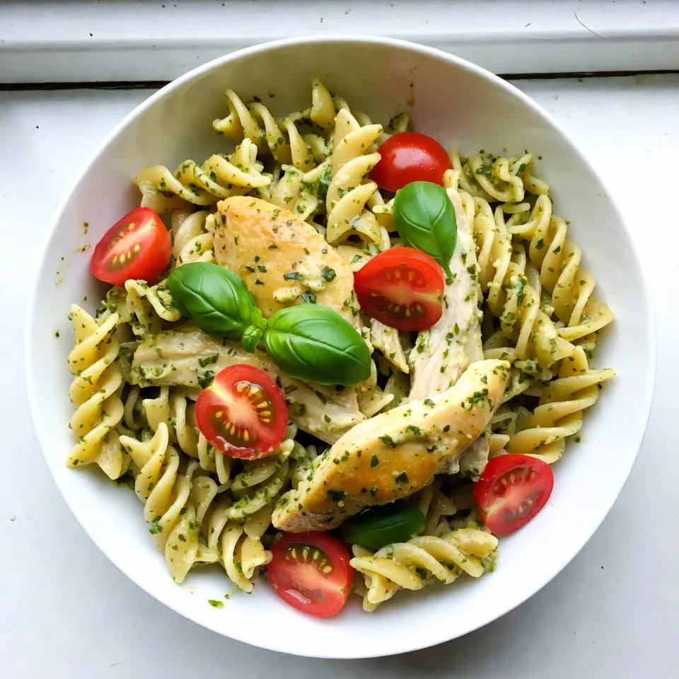 - Pasta options: Use 300g of fusilli or penne for the best texture. - Chicken specifications: Choose 2 boneless chicken breasts, sliced into thin strips. - Pesto type: Go for 1 cup of freshly made basil pesto for bright flavor. - Dairy components: Grab 1 cup of heavy cream and 1/2 cup of freshly grated Parmesan cheese. - Additional ingredients: Use 2 tablespoons of extra virgin olive oil, 2 cloves of minced garlic, sea salt, and freshly ground black pepper to taste. Don't forget garnishes like a handful of halved cherry tomatoes and fresh basil leaves. These ingredients come together to create a rich and flavorful dish. Each one plays a key role in building layers of taste. The pasta serves as the perfect base, while the chicken adds protein and heartiness. The pesto brings in fresh herbs, and the cream creates that luscious texture. Finally, the garnishes not only beautify the dish but add a burst of flavor. {{ingredient_image_2}} To start, fill a large pot with water and add salt. Bring it to a rolling boil. Once boiling, add 300 grams of pasta, like fusilli or penne. Cook it for 8 to 10 minutes. You want it to be firm, or al dente. This means it should have a slight bite when you taste it. After cooking, drain the pasta but save about a cup of the pasta water. This water is key for the sauce later. Next, heat two tablespoons of extra virgin olive oil in a large skillet over medium heat. While the oil heats, season two boneless chicken breasts, cut into strips, with sea salt and black pepper. Add the chicken to the skillet. Cook it for about 5 to 6 minutes, stirring often. You want the chicken to turn golden brown and cook fully. This step adds flavor and texture to your dish. Once the chicken is ready, add two cloves of minced garlic to the skillet. Sauté it for about a minute until it smells great. Then, lower the heat and pour in one cup of heavy cream. Next, mix in one cup of freshly made basil pesto and half a cup of grated Parmesan cheese. Stir well until the sauce is smooth. If it’s too thick, add a splash of the reserved pasta water to thin it out. This step makes the sauce creamy and rich. Now, it’s time to bring everything together. Gently fold the drained pasta into the skillet. Make sure the pasta gets a good coating of the creamy pesto sauce. Mix it well with the chicken. This ensures every bite is full of flavor. For the final touch, serve your creamy pesto chicken pasta right away. Garnish it with halved cherry tomatoes and fresh basil leaves. This not only enhances the flavor but also adds a beautiful pop of color to your dish. Enjoy your meal! To make the creamy sauce perfect, start with fresh pesto. Freshly made pesto has bright flavors that store-bought cannot match. Adjust the flavors by adding more garlic or cheese if you prefer a stronger taste. You can also add a pinch of red pepper flakes for a kick. If the sauce is too thick, add a splash of pasta water. This helps to smooth it out and adjust the creaminess. Taste as you go, and make it your own. For tender chicken, slice the breasts into strips. This helps them cook evenly and quickly. Season them well with sea salt and black pepper before cooking. Heat the olive oil until it shimmers but not too hot. This helps to sear the chicken without burning it. Cook the chicken for about 5-6 minutes until golden brown. Don't overcrowd the pan; this ensures even cooking. If you want juicy chicken, let it rest for a few minutes after cooking. To avoid overcooked pasta, watch the timer closely. Follow the package instructions for al dente texture. Usually, this means cooking for about 8-10 minutes. Stir the pasta occasionally to prevent sticking. Remember to save some pasta water before draining. This water is full of starch and helps the sauce cling better to the pasta. If you accidentally overcook it, toss it with a bit of olive oil to help. Pro Tips Use Fresh Ingredients: Fresh basil and homemade pesto significantly enhance the flavor of this dish. Consider making your own pesto for a richer taste. Don’t Overcook the Pasta: Aim for al dente pasta; it will continue to cook slightly when combined with the sauce, ensuring it retains a perfect bite. Adjust Sauce Consistency: If the sauce is too thick, gradually add reserved pasta water until you achieve your desired creaminess without it becoming too runny. Garnish for Flavor: Adding cherry tomatoes and fresh basil not only adds color but also a fresh burst of flavor that complements the creamy pesto sauce beautifully. {{image_4}} You can boost the nutrition and flavor of your creamy pesto chicken pasta by adding vegetables. Try seasonal veggies like spinach, zucchini, or bell peppers. They cook quickly and blend well with the creamy sauce. I also love adding cherry tomatoes for a sweet burst. Just toss them in when you combine the pasta and sauce. This adds color and freshness to your dish. If you want to switch up the protein, consider using shrimp or tofu. Shrimp cooks fast and adds a nice seafood flavor. For a vegetarian option, use chickpeas or lentils. Both bring good protein and texture. If you want something lighter, try grilled mushrooms. They have a meaty feel and soak up the creamy sauce well. Feel free to experiment with the sauce. Store-bought pesto can save time, but homemade is always best. You can also mix different herbs like cilantro or arugula for a twist. Adding sun-dried tomatoes or nuts like walnuts can make the sauce richer. If you want a spicy kick, blend in some red pepper flakes. Each option can give your dish a unique taste. To store leftovers, use airtight containers. Glass or plastic containers work well. Keep the pasta in the fridge for up to three days. If you want to save it longer, freezing is a great option. For reheating, you can use a microwave or stovetop. If using a microwave, place the pasta in a bowl. Add a splash of water to keep it moist. Heat in 30-second bursts until warm. If using the stovetop, place it in a pan over low h