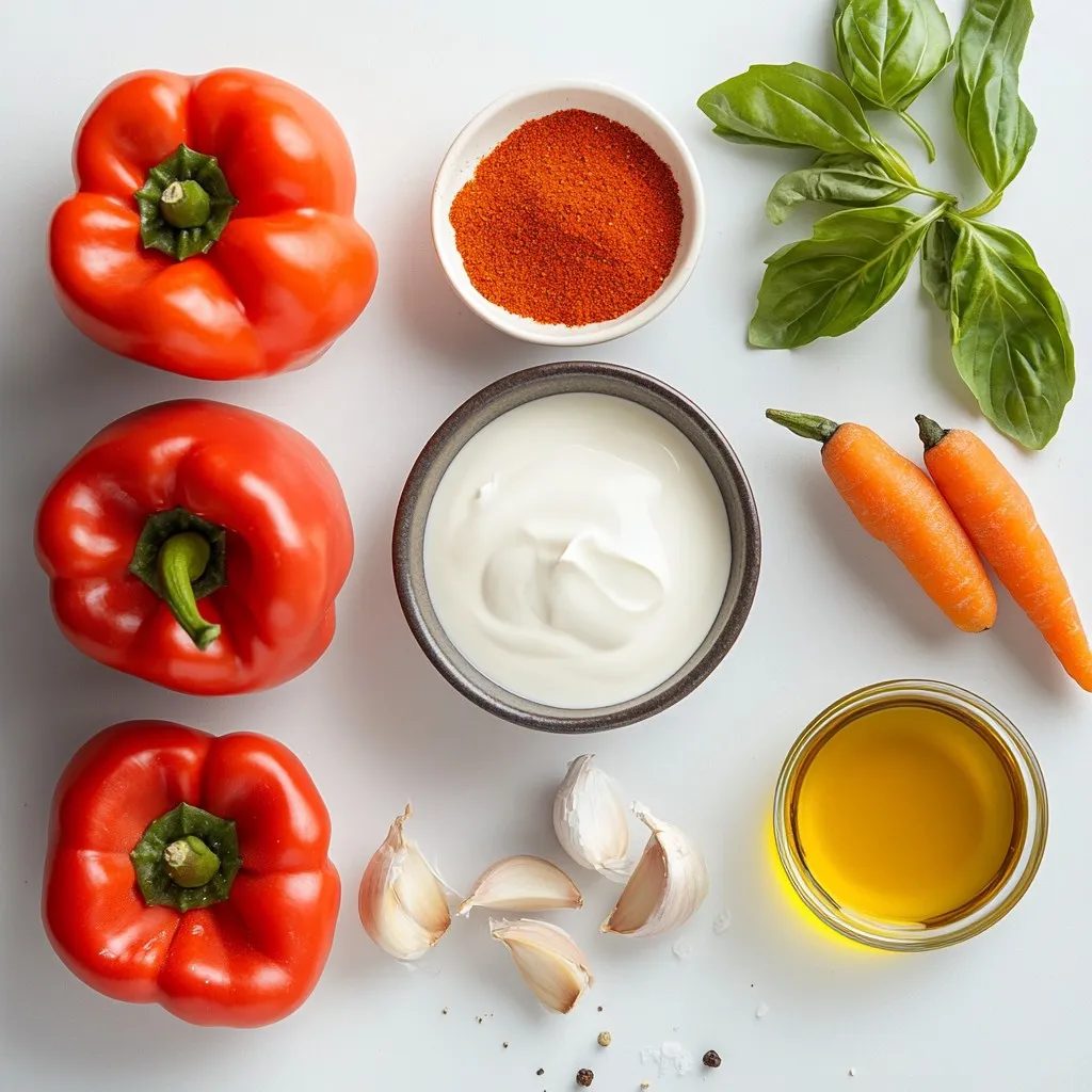 Gathering the right ingredients is key to making this creamy roasted red pepper soup. Start with four large red bell peppers. They give the soup its sweet and smoky base. Next, get one medium onion. Finely chop it to add depth. Don’t forget three cloves of garlic. Mince them for a strong flavor.