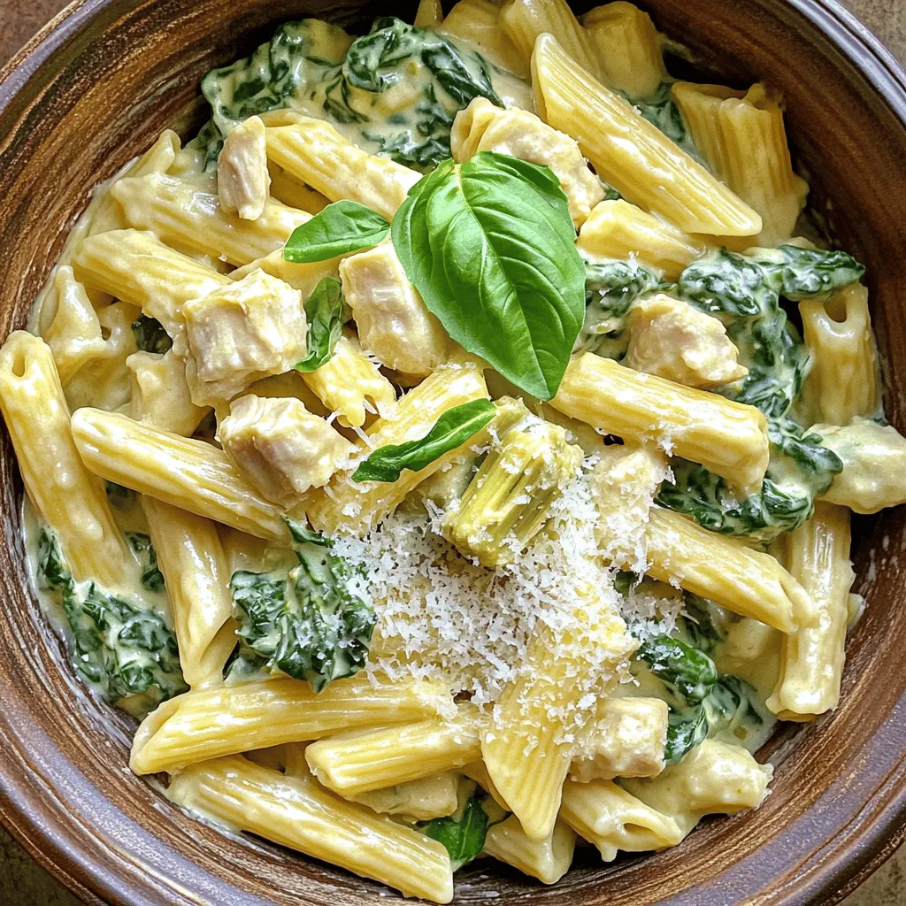 - 12 oz penne pasta - 1 lb boneless, skinless chicken breasts, diced into bite-sized pieces - 2 cups fresh spinach, roughly chopped - 1 can (14 oz) artichoke hearts, drained and quartered - 1 cup cream cheese, softened at room temperature - 1 cup freshly grated parmesan cheese - 1 teaspoon garlic powder - 1 teaspoon onion powder - 1 teaspoon Italian seasoning blend - 2 tablespoons extra virgin olive oil This creamy spinach artichoke chicken pasta dish is packed with flavor. The penne pasta serves as the perfect base, soaking up the rich sauce. I love using boneless, skinless chicken breasts for their tenderness. The fresh spinach adds a pop of color and nutrition. Artichoke hearts bring a tangy twist that pairs well with the other ingredients. For the creamy texture, cream cheese is essential. It melts beautifully into the dish, creating a rich sauce. The freshly grated parmesan adds a savory touch that I can't resist. Seasonings like garlic powder, onion powder, and Italian blend transform this meal into something special. Olive oil gives a nice base to cook the chicken and adds depth to the flavors. When making this dish, gather all your ingredients first. It makes the cooking process smoother and more enjoyable. Trust me, having everything ready will help you create a delightful meal every time! First, heat two tablespoons of olive oil in a large pot over medium heat. Once the oil is hot, add one pound of diced chicken. Season it well with salt, pepper, garlic powder, and onion powder. Cook the chicken for about 5-7 minutes. Stir it often. You want the chicken to be golden brown and cooked through. Use a meat thermometer to check the temperature. It should reach 165°F to be safe to eat. Next, pour in one cup of low-sodium chicken broth. Use a wooden spoon to scrape any tasty bits from the pot's bottom. Raise the heat slightly and bring the broth to a gentle simmer. Carefully add 12 ounces of penne pasta, making sure it is fully submerged. Cover the pot with a lid and cook for about 10 minutes. Stir every few minutes to prevent sticking. Once the pasta is tender, reduce the heat to low. Add one cup of softened cream cheese, one cup of freshly grated parmesan cheese, two cups of roughly chopped spinach, and one can of drained and quartered artichoke hearts. Gently stir all the ingredients together. Allow the cream cheese to melt and mix in well. This should take about 2-3 minutes. If the sauce is too thick, add a splash of chicken broth to reach your desired creaminess. Taste and adjust with more salt, pepper, or Italian seasoning if needed. Let the dish sit for a few minutes to let the flavors meld before serving. - To prevent pasta from sticking, stir it well during cooking. This helps keep it loose. - If your sauce is too thick, add a bit more chicken broth. Mix well until smooth. - You can add extra spices like red pepper flakes for heat. This gives a nice kick. - For garnishing, freshly torn basil adds color and flavor. Grate more parmesan on top, too. - An ideal pot is a large Dutch oven. It distributes heat well for even cooking. - A wooden spoon is useful for mixing. It helps avoid scratching your pot. {{image_4}} Alternative protein choices If you want a change from chicken, try using shrimp or tofu. Both add great flavor. You can also use cooked sausage or turkey for a different taste. Vegetable swaps Feel free to get creative with veggies! Kale or arugula can replace spinach. You could also add mushrooms, bell peppers, or zucchini for more texture and color. Gluten-free options To make this dish gluten-free, swap the penne pasta for a gluten-free pasta. There are many good options available in stores. Just be sure to check the cooking time, as it may differ. Vegan alternatives For a vegan twist, use plant-based cream cheese and skip the chicken. You can add chickpeas or lentils for protein. Nutritional yeast can replace parmesan for a cheesy taste. Instant pot version If you are short on time, use an Instant Pot. Start by sautéing the chicken in the pot, then add the broth and pasta. Cook on high pressure for about 4 minutes. After that, stir in the cream cheese and veggies. Oven-baked variations For a baked version, cook as usual but transfer to a baking dish before adding cheese. Top with extra cheese and bake at 350°F until bubbly and golden, about 20 minutes. This gives a nice crispy top. To store leftovers, let the pasta cool down first. Then, place it in an airtight container. This helps keep the creamy texture and flavors intact. You can store it in the fridge for up to three days. Make sure to reheat it properly to enjoy the taste again. If you want to freeze the dish, use a freezer-safe container. It should seal tightly. This pasta can last for about two months in the freezer. When you're ready to eat it, thaw it overnight in the fridge. Reheat it gently on the stove, adding a splash of chicken broth to keep it creamy. The creamy spinach artichoke chicken pasta stays fresh for about three days in the fridge. When frozen, it can last for up to two months. Always check for any off smells or changes in texture before eating. Enjoy your delicious meal even after cooking day! You can use Greek yogurt for a tangy twist. Sour cream also works well for creaminess. If you prefer a dairy-free option, try cashew cream or coconut cream. These alternatives keep your dish rich and smooth. Always check the flavor to ensure it matches your taste. Yes, you can use frozen spinach in this dish. Just thaw it first and drain any excess water. This helps keep the pasta from getting too watery. Frozen spinach is a great time-saver and still adds nice flavor and nutrition. The chicken is fully cooked when it reaches 165°F. You can check this with a meat thermometer. Besides temperature, look for a golden color and firm texture. Cut a piece open; the meat should be white, not pink. This ensures your meal is safe and tasty. This article covered a delicious recipe with penne pasta, chicken