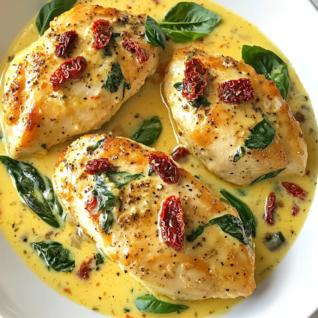 - Add the chopped fresh spinach to the sauce, stirring until it wilts, which should take about 2 minutes. Finally, return the seared chicken to the skillet, allowing it to soak in the creamy sun-dried tomato sauce. Let everything simmer together for another 2 minutes to meld the flavors beautifully.