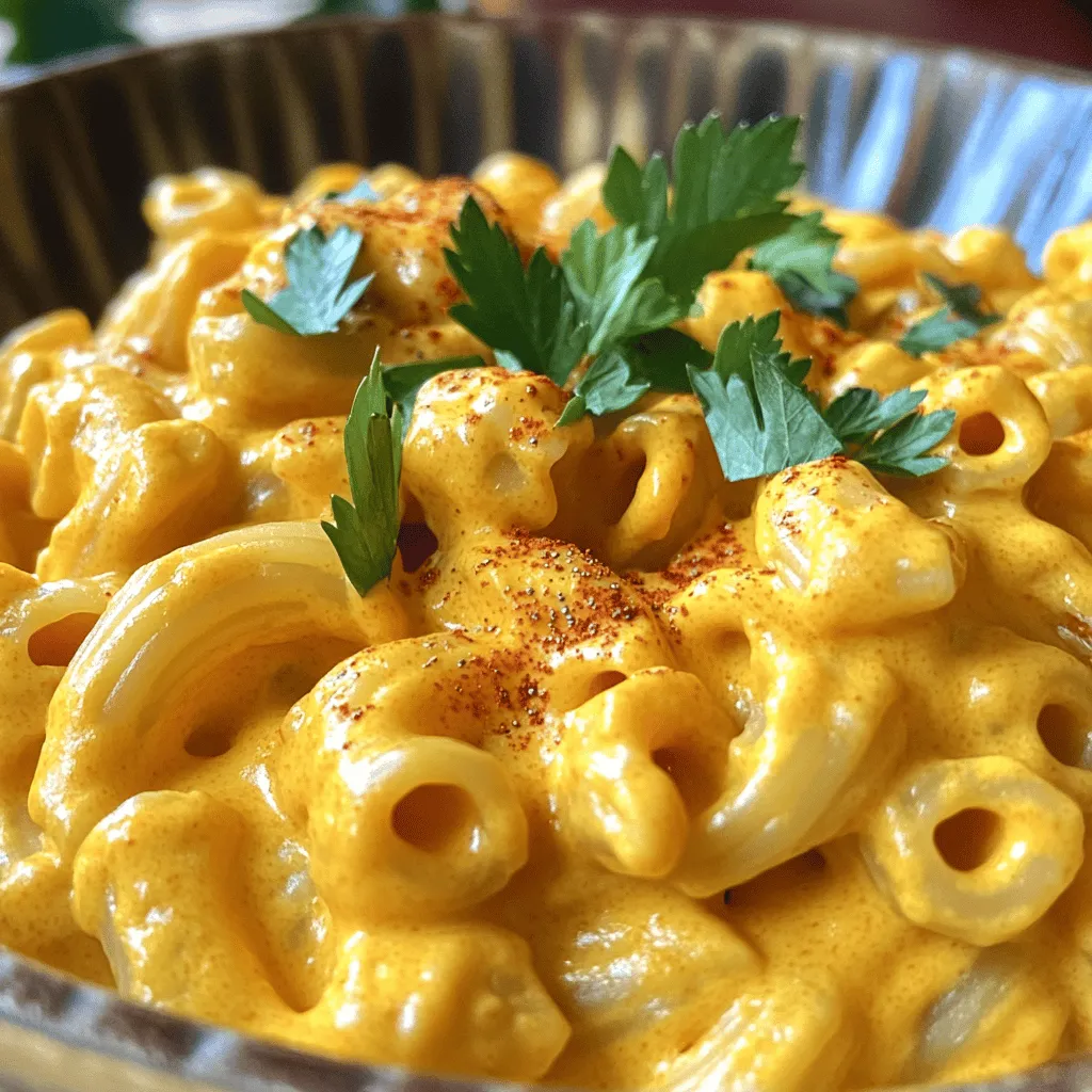 When you serve your vegan pumpkin mac and cheese, think about how it looks. Use colorful bowls to make the dish pop. A sprinkle of nutritional yeast on top adds a nice touch. You can also add a dash of smoked paprika for extra color.