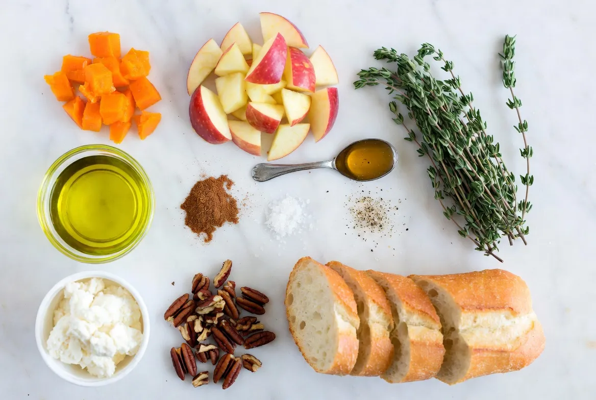 Yes, you can prepare components ahead of time. Roast the butternut squash and apple a day in advance. Store them in the fridge. You can also mix the ricotta with thyme ahead of time. Toast the bread just before serving for the best texture.