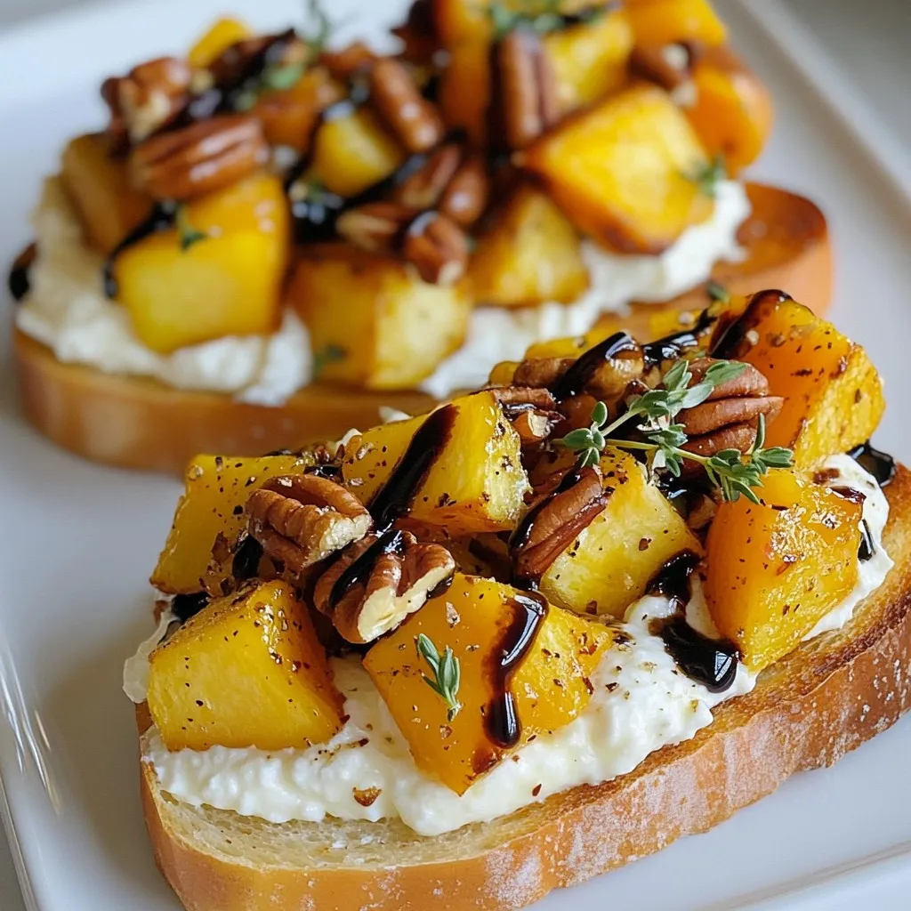 To put it all together, take a toasted baguette slice. Spread a generous layer of herbed ricotta on top. Then, add a spoonful of the roasted butternut and apple mix. For extra crunch, sprinkle some roughly chopped pecans over each slice. Finally, drizzle with balsamic glaze for a sweet finish. Add a few extra thyme leaves for a touch of color. This will make your bruschetta look even more appealing!