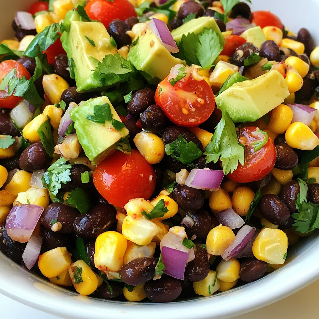 - 1 cup corn kernels (freshly cooked or frozen) - 1 can (15 oz) black beans, thoroughly rinsed and drained - 1 red bell pepper, finely diced - 1 small red onion, finely chopped - 1 cup cherry tomatoes, halved - 1 ripe avocado, diced - 2 tablespoons fresh cilantro, roughly chopped To make this salad pop, I use fresh corn kernels. You can use frozen corn if you want. Both options work well. The black beans add protein and fiber. Rinsing them helps reduce sodium. The red bell pepper gives a sweet crunch. The red onion adds a nice bite. Cherry tomatoes add juicy bursts. Avocado brings creaminess and healthy fats. Finally, fresh cilantro adds a fragrant touch. - 2 tablespoons freshly squeezed lime juice - 2 tablespoons extra virgin olive oil - 1 teaspoon ground cumin - 1 teaspoon chili powder - Salt and freshly ground black pepper to taste For the dressing, I always use freshly squeezed lime juice. It brightens the salad. The extra virgin olive oil adds richness. Ground cumin and chili powder bring warm notes. Finally, salt and black pepper enhance all the flavors. - Calories per serving: Approximately 180 - Macronutrients breakdown: 7g protein, 10g fat, 18g carbohydrates - Dietary considerations: This salad is vegan and gluten-free. Each serving is about 180 calories. It provides a good mix of protein, fats, and carbs. The salad is vegan and gluten-free, making it great for many diets. Enjoy it as a light meal or a side dish. {{ingredient_image_2}} Cooking fresh corn is easy. Boil water in a pot. Add the corn and cook for 3-5 minutes. The corn should be tender. Then, drain and let it cool. If you use frozen corn, thaw it in warm water or microwave. Make sure it warms up evenly, then cool it down. In a large bowl, add the cooled corn. Next, add 1 can of rinsed black beans. Then, mix in the finely diced red bell pepper and chopped red onion. Use a spoon to stir gently. This keeps the ingredients mixed evenly without breaking them. Now, it's time for delicate ingredients. Gently add the halved cherry tomatoes and diced avocado. Be careful to keep the avocado pieces intact. This adds nice texture to your salad and looks great too. In a small bowl, whisk together the dressing. Combine freshly squeezed lime juice, extra virgin olive oil, ground cumin, and chili powder. Don't forget to add salt and black pepper. This mixture will give your salad a bright and tasty flavor. Drizzle the dressing over the salad. Use a large spoon to toss everything gently. Make sure all ingredients are coated but avoid mashing the avocado. You want nice, chunky pieces for the best texture. Finally, sprinkle roughly chopped cilantro over the salad. Give it one last gentle toss. This fresh herb adds a burst of flavor and bright color to your dish. Enjoy your Fiesta Corn Black Bean Salad! To make the best Fiesta Corn Black Bean Salad, start with ripe avocados. Look for avocados that give slightly when you press them. This shows they are ready to eat. If they feel hard, let them ripen at room temperature for a few days. Adjust the seasonings to your taste. If you like more spice, add extra chili powder. If you want more tang, add more lime juice. Taste as you mix to find your perfect balance. Serving your salad in colorful bowls makes it more fun. Bright colors catch the eye and make your dish pop. You can also divide the salad into individual cups for a nice touch. Garnish each serving with lime wedges. This not only adds color but also gives diners a chance to add more lime juice if they want. Be careful not to overcook the corn. Cook it just until tender, about 3-5 minutes. Overcooked corn can lose its sweet crunch. Do not mash the avocado when mixing. Gently fold it in with the other ingredients. You want to keep those beautiful avocado pieces intact for a nice look and taste. Pro Tips Use Fresh Ingredients: Whenever possible, opt for fresh corn and ripe avocados to enhance the flavor and texture of your salad. Chill Before Serving: Allow your salad to chill in the refrigerator for at least 30 minutes before serving. This allows the flavors to meld and intensify. Customize Your Spices: Feel free to adjust the amount of cumin and chili powder based on your spice preference. You can also add jalapeños for an extra kick! Perfect for Meal Prep: This salad holds up well in the fridge for a couple of days, making it a great option for meal prep or potlucks. {{image_4}} You can switch out black beans for kidney beans. Kidney beans add a nice color and texture. If you want to change the flavor, try using pinto beans too. For bell peppers, use yellow or green ones. They add different flavors and look great in the salad. For a kick, add jalapeños. They give the salad a nice heat. You can slice them thin or dice them small. If you love cheese, try adding feta or cotija. These cheeses melt slightly and add a creamy taste. In summer, add fresh corn or zucchini. In fall, diced butternut squash works well. You can also try fresh peas in spring. Always adapt based on what’s in season. This keeps your salad fresh and exciting. To keep your Fiesta Corn Black Bean Salad fresh, store it in the fridge. Use an airtight container to prevent air from spoiling the salad. If you have a large batch, divide it into smaller portions. This makes it easy to grab a quick snack or side dish later. This salad stays fresh in the refrigerator for about 3 to 5 days. Check for signs of spoilage before eating. If the colors look dull or if there is a bad smell, it’s best to throw it away. Mold is another clear sign that the salad is no longer safe to eat. You can freeze Fiesta Corn Black Bean Salad, but it may lose some texture. If you want to freeze it, leave out the avocado and fresh cilantro. These ingredients don’t freeze well. Store the rest in a freezer-safe container. When you are ready to eat it, thaw in the fridge overnight before serving. Yes, you can make this salad ahead of time. To prep in advance, follow these tips: - Chop Veggies: Dic