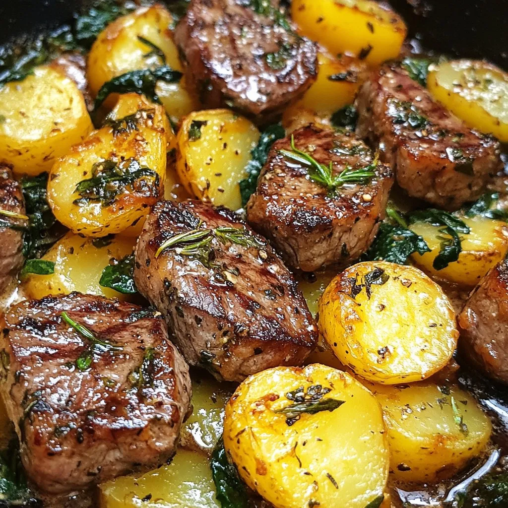 - Toss the crispy potatoes in the garlic herb butter to coat them thoroughly. Then, return the seared steak to the skillet and gently mix everything together to ensure the flavors combine beautifully.