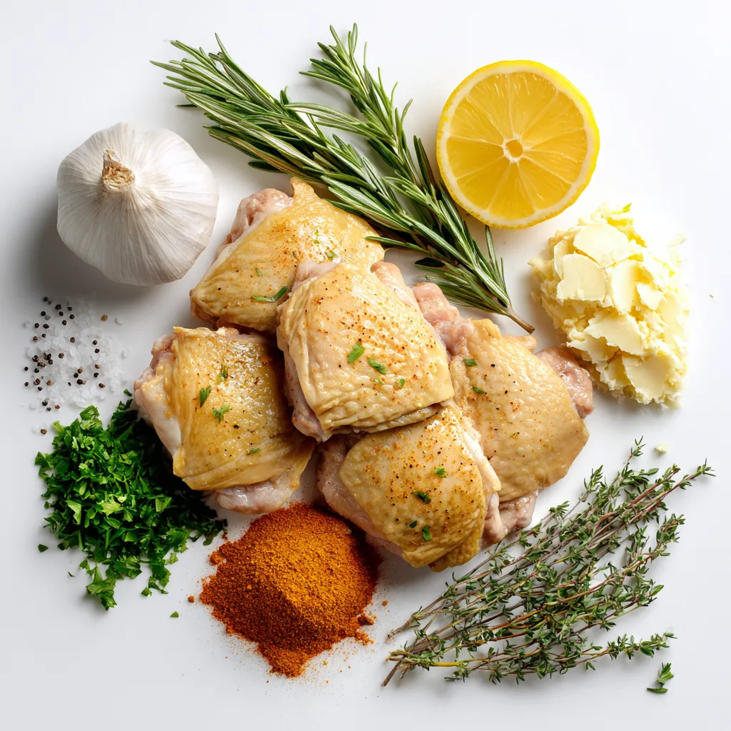 Now, take your chicken thighs. Pat them dry using paper towels. This step is key for crispy skin. Season both sides with sea salt and black pepper. Then, lift the skin gently and spread some garlic herb butter underneath. Use the rest of the butter to coat the top. This ensures that every bite is packed with flavor.
