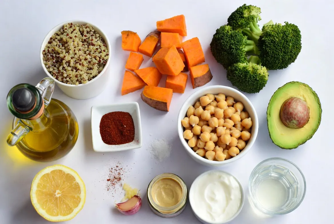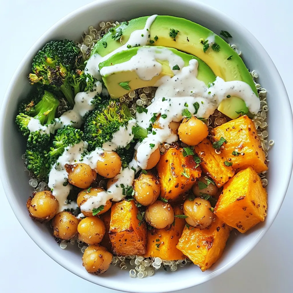 - In a large serving bowl or individual bowls, start by layering a generous portion of the fluffy quinoa at the bottom. Neatly arrange the roasted sweet potatoes, blanched broccoli, and sautéed chickpeas on top. Finish with slices of creamy avocado and drizzle liberally with the flavorful tahini yogurt sauce.