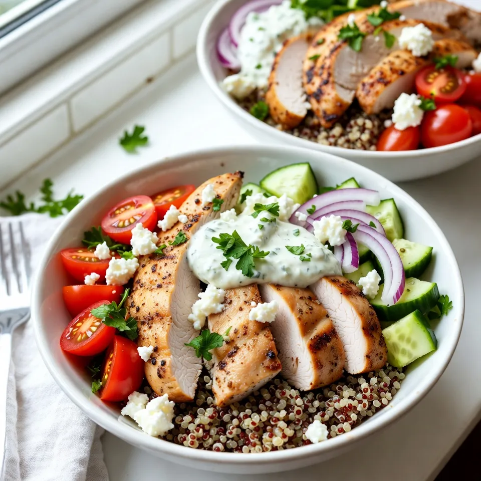 - Chicken and Marinade Ingredients - 2 boneless, skinless chicken breasts - 3 tablespoons extra virgin olive oil - 3 cloves garlic, finely minced - 1 tablespoon dried oregano - 1 teaspoon smoked paprika - Juice of 1 lemon - Salt and black pepper to taste - Base Ingredients - 1 cup cooked quinoa or brown rice - Toppings and Garnishes - 1 cup cherry tomatoes, halved - 1 cucumber, diced into bite-sized pieces - 1/2 red onion, thinly sliced - 1/2 cup feta cheese, crumbled - 1/4 cup tzatziki sauce (store-bought or homemade) - Fresh parsley, chopped (for garnish) These ingredients create a tasty and colorful Greek Chicken Gyro Bowl. The chicken marinated in olive oil, garlic, and spices gives it great flavor. The base of quinoa or brown rice adds a nice texture. Fresh veggies like tomatoes and cucumber make your bowl bright and healthy. Crumbled feta and tzatziki sauce tie everything together with rich, creamy goodness. Enjoy each bite of this well-balanced meal! {{ingredient_image_2}} To start, combine the marinade ingredients. In a large zip-top bag, whisk together: - 3 tablespoons extra virgin olive oil - 3 cloves garlic, finely minced - 1 tablespoon dried oregano - 1 teaspoon smoked paprika - Juice of 1 lemon - Salt and black pepper to taste Add the chicken breasts to this mix. Make sure they are well coated. Seal the bag or cover the dish. Place it in the fridge for at least 30 minutes. If you have time, marinate overnight for even better flavor. Next, cook the chicken. Preheat your grill or a stovetop grill pan to medium-high heat. Take the chicken from the marinade and let any excess drip off. Grill each breast for about 6-7 minutes on each side. You want the internal temperature to reach 165°F (75°C). When done, transfer the chicken to a cutting board. Allow it to rest for a few minutes before slicing it thinly. While the chicken grills, prepare your base. Cook 1 cup of quinoa or brown rice according to the package instructions. After cooking, fluff the grains with a fork. Let them cool slightly before using. Now it’s time to assemble the bowls. In individual serving bowls, start with a generous scoop of cooked quinoa or brown rice. Next, arrange the sliced grilled chicken on top. Add a colorful mix of: - Halved cherry tomatoes - Diced cucumber - Thinly sliced red onion This will create a vibrant and appealing presentation. Next, sprinkle crumbled feta cheese over the bowls. This adds a rich, tangy flavor. Top each bowl with a dollop of tzatziki sauce for creaminess. If you like, drizzle a bit of extra olive oil for richness. Finish your bowls with a sprinkle of chopped parsley. This adds color and freshness. Serve the Greek Chicken Gyro Bowls right away. Enjoy the delicious blend of flavors in each bite! To get the best chicken for your gyro bowls, marination is key. You want to mix olive oil, garlic, oregano, smoked paprika, lemon juice, salt, and pepper. Use a large zip-top bag or shallow dish to blend these well. Add the chicken, making sure it is fully coated. Seal the bag or cover the dish. Let it chill in the fridge for at least 30 minutes, or overnight if you can. This makes the chicken flavorful and tender. When cooking, the goal is juiciness. Preheat your grill or stovetop pan to medium-high heat. Take the chicken out of the marinade and let the extra drip off. Grill for about 6-7 minutes on each side. You want the chicken's internal temperature to reach 165°F (75°C). This ensures it is safe to eat and not pink inside. After cooking, let the chicken rest for a few minutes before slicing. This helps keep the juices in. You can cook chicken in different ways. Grilling gives a nice smoky flavor. If you prefer, use a stovetop grill pan or skillet. Both work great. For oven cooking, preheat to 400°F (200°C). Place the marinated chicken on a baking sheet. Bake for about 20-25 minutes, or until done. All methods give tasty results. Feel free to swap ingredients based on your needs. If you want a vegetarian option, try chickpeas or grilled veggies instead of chicken. For gluten-free options, use quinoa or brown rice as your base. You can also change up the seasonings. Add cumin or coriander for a different taste. Experiment with herbs like dill or parsley for extra flavor. This recipe is easy to make your own! Pro Tips Marinate Longer for More Flavor: For the best flavor, marinate the chicken for at least 2-4 hours, or even overnight. This allows the spices and lemon juice to penetrate the meat thoroughly. Perfectly Grill the Chicken: Ensure your grill is preheated to medium-high heat before adding the chicken. This helps to achieve a nice sear and prevents the chicken from sticking. Customize Your Toppings: Feel free to add or substitute toppings based on your preference. Olives, bell peppers, or even avocado can add unique flavors and textures to your gyro bowls. Serve with Fresh Herbs: Adding fresh herbs like dill or mint can elevate the flavors and give your gyro bowls a fresh, vibrant taste that complements the other ingredients. {{image_4}} For a vegetarian twist, you can swap out the chicken. Here are some great substitutes: - Grilled eggplant slices - Marinated tofu cubes - Chickpeas, roasted for crunch These options give you tasty protein alternatives. I like using marinated tofu. It soaks up flavor well. To enhance your Greek Chicken Gyro Bowls, add extra ingredients. These can boost flavor and nutrition: - Artichoke hearts - Kalamata olives - Roasted red peppers Try seasonal vegetables to keep it fresh. Some suggestions include: - Zucchini in summer - Butternut squash in fall - Spinach in spring These ingredients bring a burst of color and taste. You can also change how you serve your meal. Wraps or pitas are great for a fun twist. Here are some ideas: - Fill a pita with your gyro bowl ingredients. - Use large lettuce leaves for a low-carb option. You can switch the base too. Instead of quinoa or brown rice, try: - Farro for a nutty taste - Couscous for lightness T