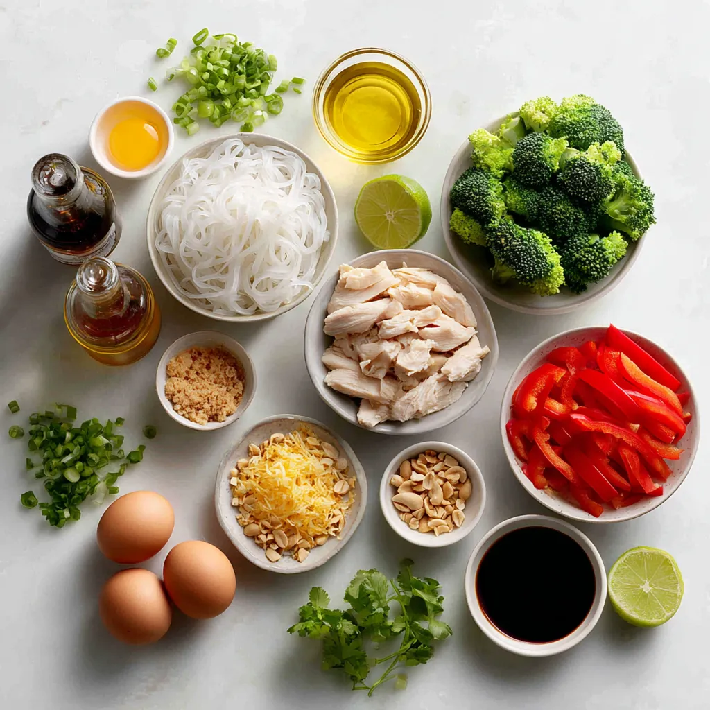 Each of these ingredients plays a key role in making this dish flavorful and nutritious. Rice noodles serve as the base, providing a soft texture. Chicken adds protein, while the veggies bring crunch and color. Olive oil helps cook everything evenly. Garlic gives a nice aroma and taste. Eggs add richness, and bean sprouts give a fresh bite. The red bell pepper and broccoli add vitamins and minerals. Green onions and cilantro enhance the flavor. Finally, lime juice and soy sauce provide a zesty finish.