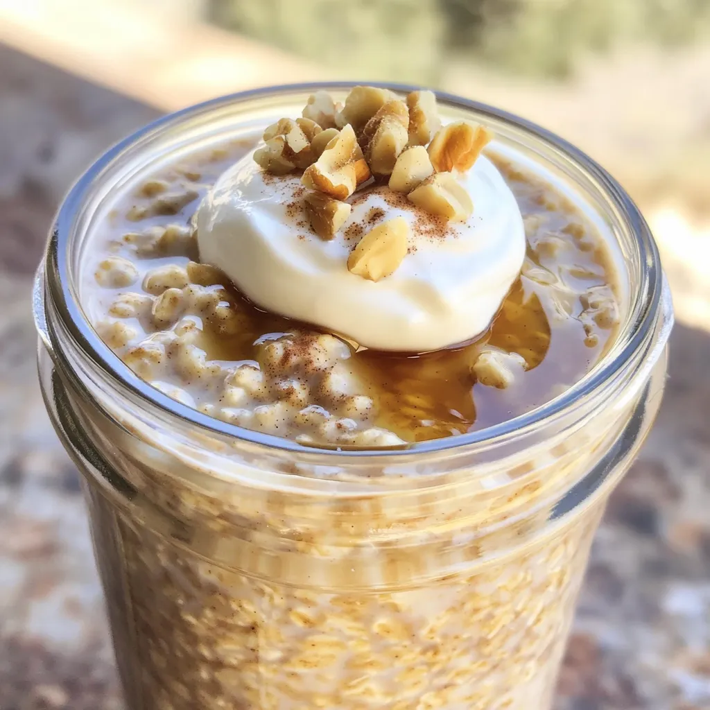 - 1 cup rolled oats - 1 cup unsweetened almond milk - 1 scoop vanilla protein powder - 1 tablespoon chia seeds - 1 tablespoon pure maple syrup - 1 teaspoon ground cinnamon - 1/2 teaspoon vanilla extract - A pinch of salt - 2 tablespoons chopped walnuts - 2 tablespoons plain Greek yogurt - Additional maple syrup for drizzling When I make High-Protein Cinnamon Roll Overnight Oats, I always start with these key ingredients. Rolled oats form the base, giving a great texture. Unsweetened almond milk adds creaminess without extra sugar. I love using vanilla protein powder for an extra boost. Chia seeds not only thicken the mix but also add fiber. I sweeten my oats with pure maple syrup. The ground cinnamon gives that warm, cozy flavor. A pinch of salt enhances all the tastes. If you want a little crunch, add chopped walnuts. For a creamy finish, top with Greek yogurt. A drizzle of maple syrup can make it even sweeter! - In a medium bowl, combine 1 cup rolled oats and 1 cup unsweetened almond milk. - Add 1 scoop vanilla protein powder and 1 tablespoon pure maple syrup. - Mix in 1 tablespoon chia seeds, 1 teaspoon ground cinnamon, and a pinch of salt. Stir well with a whisk or fork. Make sure there are no clumps of protein powder. The chia seeds should blend in nicely. If you want a little crunch, fold in 2 tablespoons of chopped walnuts. This adds great texture. - Carefully divide the mixture into two jars or containers. - Seal the jars tightly and place them in the fridge. Refrigerate them overnight or for at least 4 hours. This helps the oats soak up the liquid and get soft. - When you wake up, take the jars out of the fridge. Give the oats a good stir. - If the mix is too thick, add a splash of milk to make it creamier. Top each jar with 2 tablespoons of plain Greek yogurt. This adds protein and creaminess. You can drizzle more maple syrup on top if you want extra sweetness. Enjoy your oats right from the jar or pour them into a bowl for a nice breakfast treat! - Adjust thickness with milk: If your oats are too thick, add more milk. This makes them creamier and easier to eat. - Let chill for optimal absorption: Keep your jars in the fridge overnight. This helps the oats soak up the milk. - Experiment with spices: Try adding nutmeg or ginger for a new twist. Small changes can make a big difference. - Use flavored protein powder: Swap vanilla for chocolate or cookies and cream. It adds fun flavors to your breakfast. - Top with fresh fruits or nuts: Fresh berries, sliced bananas, or nuts add crunch and color. They also boost nutrition and taste. {{image_4}} You can change the flavor of your overnight oats to keep things exciting. - Chocolate protein version: Swap the vanilla protein powder for chocolate. This gives a rich taste that feels like a treat. - Pumpkin spice oats for autumn: Add pumpkin puree and pumpkin spice for a cozy twist. It’s like fall in a jar! - Nut butter swirl for added richness: Mix in your favorite nut butter before chilling. This adds creaminess and a nutty flavor. You can make these oats fit your dietary needs easily. - Dairy-free alternatives: Use any plant-based milk like oat or coconut milk. They work well and keep it creamy. - Gluten-free oats: Look for certified gluten-free rolled oats. They are safe for those with gluten issues. - Low-carb sweeteners: If you want less sugar, try stevia or monk fruit. They add sweetness without the carbs. Store your High-Protein Cinnamon Roll Overnight Oats in the fridge. They stay fresh for up to four days. Use airtight jars to keep them safe. This helps maintain their creamy texture. If the oats thicken too much, add a splash of milk before eating. You can freeze your overnight oats for longer storage. To freeze, place the oats in freezer-safe jars. Leave some space at the top, as they will expand. When you want to eat them, pull a jar from the freezer. Let it thaw in the fridge overnight. To warm, microwave for a minute or two. Stir and enjoy! Yes, you can use quick oats. However, the texture will change. Quick oats cook faster and become softer. This can lead to a creamier consistency. Rolled oats are chewier and hold their shape better. If you like a thicker and heartier dish, stick to rolled oats. This recipe has about 24 grams of protein per serving. The protein comes from several sources: - 1 scoop of vanilla protein powder adds about 20 grams. - 2 tablespoons of Greek yogurt add approximately 4 grams. Overall, this dish is a protein-packed breakfast choice. Yes, you can easily make this recipe vegan. Here are some options: - Use a plant-based protein powder. - Replace Greek yogurt with dairy-free yogurt. - Choose maple syrup as your sweetener. These simple swaps keep the taste delicious and maintain a high protein level. This blog post shared a simple recipe for overnight oats. I covered the key ingredients, preparation steps, and tips to enhance flavor. You can personalize it with add-ins like nuts or yogurt. Adjust storage for freshness and explore variations for different tastes. Overnight oats are easy to make and flexible for your needs. Enjoy your healthy breakfast!