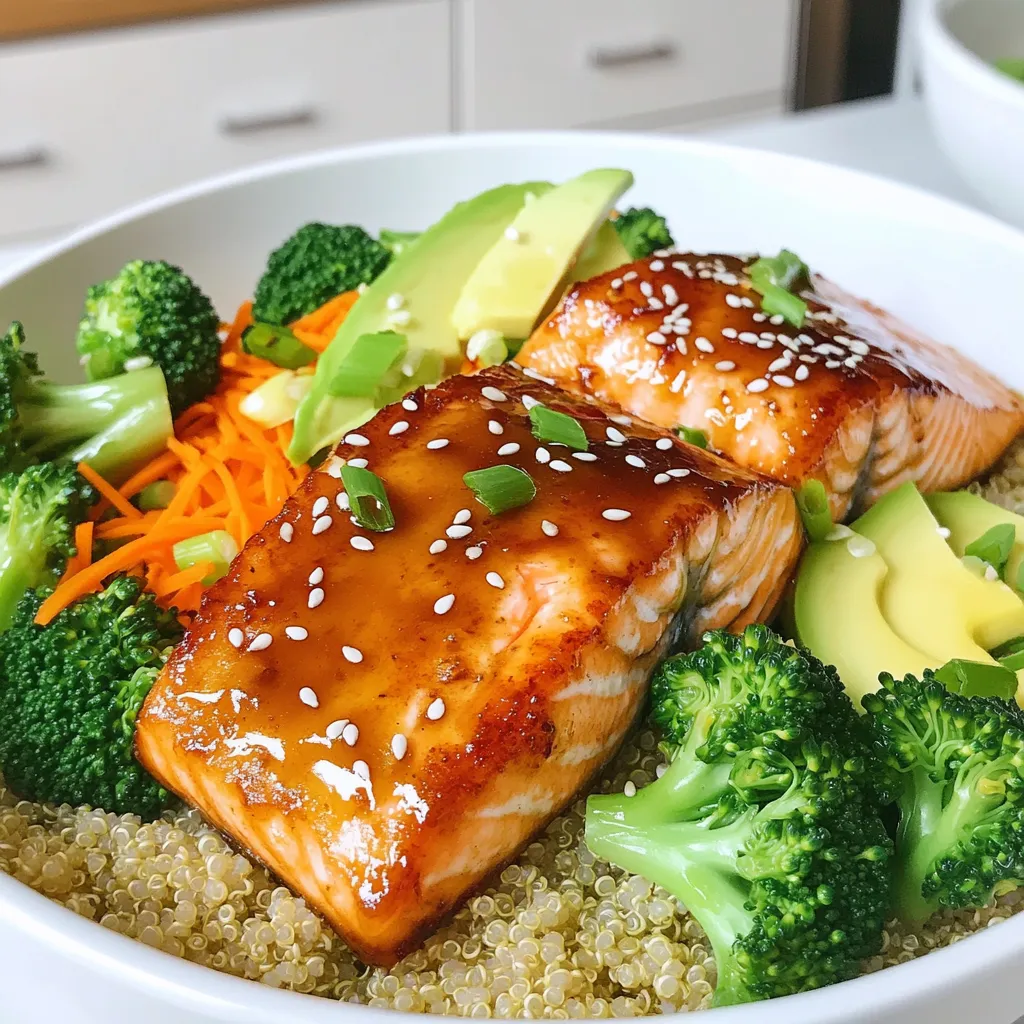 - 2 salmon fillets (6 ounces each) - 2 tablespoons honey - 2 tablespoons soy sauce (or tamari for gluten-free) - 2 cloves garlic, minced - 1 teaspoon fresh ginger, grated - 2 cups cooked quinoa - 1 cup broccoli florets, steamed - 1/2 cup carrots, shredded - 1 ripe avocado, sliced - Sesame seeds and chopped green onions for garnish - Salt and freshly cracked pepper to taste When I make Honey Garlic Salmon Bowls, I always choose fresh ingredients. The salmon fillets are the star here. Each fillet should weigh around 6 ounces. This size cooks well and stays juicy. Honey adds a sweet touch to the dish. I use two tablespoons, which balances the salt from the soy sauce. If you're gluten-free, tamari works just as well. Garlic and ginger bring bold flavors. I use two cloves of garlic and one teaspoon of ginger. Mince the garlic and grate the ginger for the best taste. Quinoa serves as a great base. I like to use two cups of cooked quinoa for its nutty flavor. It pairs well with the salmon. For color and nutrition, I add broccoli and carrots. One cup of steamed broccoli florets and half a cup of shredded carrots make the bowl pop. Finally, I slice one ripe avocado for creaminess. I also garnish with sesame seeds and green onions. They add crunch and a fresh kick. Don't forget to season with salt and freshly cracked pepper. These simple ingredients make a tasty and healthy meal. - In a small bowl, combine honey, soy sauce, garlic, and ginger. - Whisk them together until mixed well. - This sweet and savory mix adds flavor to the salmon. - Preheat a non-stick skillet over medium-high heat. - Season both sides of the salmon with salt and pepper. - Once the skillet is hot, add the salmon skin-side down. - Pour half of the marinade over the salmon. - Sauté for 4-5 minutes until golden brown. - Carefully flip the salmon using a spatula. - Pour the rest of the marinade over the salmon. - Cook for another 3-4 minutes until flaky and cooked through. - In each bowl, layer cooked quinoa first. - Next, add steamed broccoli florets and shredded carrots. - Then, place avocado slices on top of the veggies. - Gently place a salmon fillet on each bowl. - Drizzle the delicious pan sauce over the salmon. - Finish with a sprinkle of sesame seeds and green onions. To make sure your salmon is just right, cook it for about 8 to 10 minutes total. The fish should turn golden on the outside and flake easily with a fork. This means it's done! - Start by seasoning your salmon with salt and fresh pepper. This simple step boosts the taste. - You can use fresh or frozen salmon. Just be sure to thaw frozen salmon before cooking. When you arrange your bowl, aim for a rainbow of colors. This makes the dish more tempting. - Layer cooked quinoa at the bottom. Then, add steamed broccoli, shredded carrots, and avocado slices on top. - Place the salmon fillet carefully on the colors. Drizzle some pan sauce over it to make it shine. For the final touch, sprinkle sesame seeds and chopped green onions on top. This adds a nice crunch and flavor. Serve your bowls while warm for the best taste! {{image_4}} You can easily make this dish fit your needs. For a gluten-free version, swap soy sauce for tamari. This keeps the rich flavor without any gluten. If you're dairy-free, this recipe already works for you. The ingredients are all naturally free from dairy. For veggies, you can switch out broccoli and use bell peppers or snap peas. These options add great color and crunch. You can also change the grain. Instead of quinoa, try brown rice or farro. Both provide a hearty base for the salmon bowl. To give your salmon more zing, consider adding spices. A pinch of red pepper flakes can add heat. You might also enjoy a sprinkle of smoked paprika for a deeper flavor. Feel free to experiment with sauces, too. A splash of sriracha or a drizzle of teriyaki sauce can bring new life to the dish. If you want to switch proteins, try chicken or tofu. Both will soak up the honey garlic sauce well. Cooked shrimp is another tasty choice. Just ensure you adjust the cooking times for any protein changes. To keep your Honey Garlic Salmon Bowls fresh, store them in the fridge. Place leftovers in an airtight container. They can last for up to three days. Make sure to let the salmon cool before sealing it. This helps prevent sogginess. When you're ready to eat, reheat the bowl in the microwave. Use a medium power setting. Heat for about 1-2 minutes, stirring halfway through. You can also reheat in a skillet over low heat. This method keeps the salmon from drying out. Meal prep makes weeknight dinners easy. Start by cooking extra quinoa on the weekend. Store it in the fridge for quick access. You can also pre-chop the broccoli and carrots. Keep them in sealed bags or containers. Another great tip is to marinate the salmon in advance. Just place the fillets in the marinade and store them in the fridge. This adds flavor and saves time. When you are ready to eat, just cook the salmon and assemble your bowls. It’s that simple! Making Honey Garlic Salmon Bowls is quick and easy. It takes about 5 minutes to prep. Cooking the salmon takes around 10 minutes. In total, you can enjoy this meal in just 15 minutes. Yes, you can use frozen salmon. First, thaw the salmon in the fridge overnight. If you're short on time, you can run it under cold water for about 30 minutes. Once thawed, cook it as you would fresh salmon. The salmon will still taste great! These salmon bowls pair well with many sides. Here are some ideas: - Steamed asparagus - Sautéed green beans - A fresh garden salad - Rice or cauliflower rice - Lemonade or sparkling water These sides will enhance your meal and give you more flavors to enjoy! This blog post covered how to make delicious Honey Garlic Salmon Bowls. I shared the needed ingredients, step-by-step cooking instructions, and tips for perfect results. You learned about storage and meal prep to make your cooking easier. Feel free to tweak the recipe wit