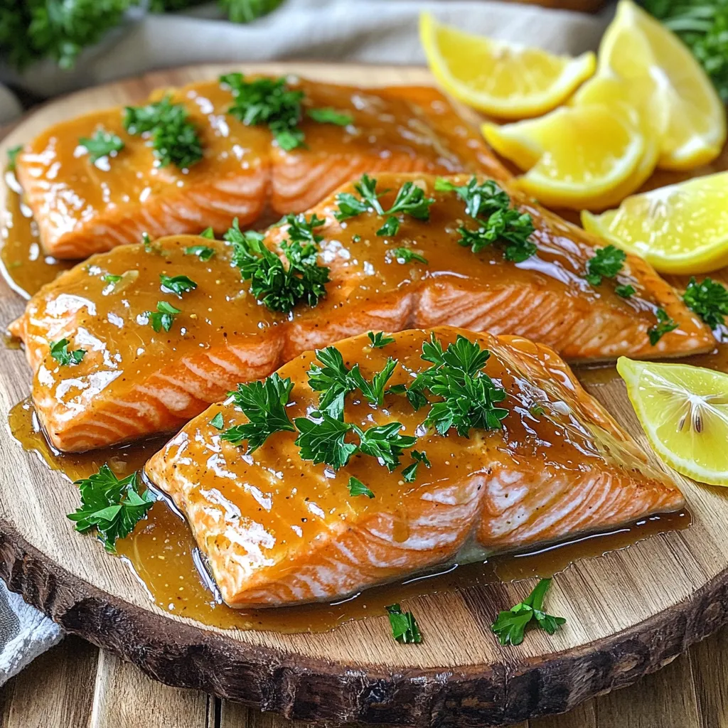 Garnishing with parsley adds color and freshness. Lemon wedges offer a bright flavor that balances the sweetness of the glaze. You can serve the salmon with sides like steamed veggies or rice for a complete meal.