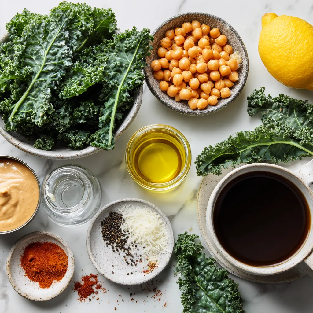 Kale Caesar Salad with Crispy Chickpeas starts with simple yet wholesome ingredients. First, you need fresh kale. I prefer to use four cups, chopped into bite-sized pieces. This helps you enjoy the crunchy texture.
