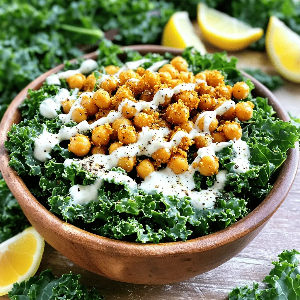 To make a great Kale Caesar Salad, you need some key ingredients. Here’s what you'll need: - 1 bunch of kale, with stems removed and leaves chopped into bite-sized pieces - 1/4 cup grated Parmesan cheese (or nutritional yeast for a vegan-friendly option) - 1/2 cup Greek yogurt (or a suitable vegan alternative) - 2 tablespoons freshly squeezed lemon juice - 1 tablespoon Dijon mustard - 1 clove garlic, minced finely - 1/4 cup whole wheat croutons (optional, for extra crunch) - Salt and freshly ground black pepper, to taste These ingredients blend to create a rich and creamy dressing that coats the kale nicely. Crispy chickpeas add fun and crunch to your salad. Here’s what you need for them: - 1 can (15 oz) chickpeas, thoroughly drained and rinsed - 2 tablespoons olive oil, divided - Salt and freshly ground black pepper, to taste Roasting chickpeas gives them a lovely crunch. You’ll love their flavor! You can easily make this salad plant-based or gluten-free. Here are some tips: - Use nutritional yeast instead of Parmesan cheese for a vegan option. - Swap Greek yogurt with a plant-based yogurt. - If you need a gluten-free option, make sure your croutons are gluten-free or skip them altogether. With these swaps, everyone can enjoy this tasty salad! For the full recipe, check out the details provided. First, I preheat my oven to 400°F (200°C). I take a can of chickpeas and drain it well. Rinsing the chickpeas helps reduce the sodium and makes them crispier. I then place them on a baking sheet. Next, I drizzle one tablespoon of olive oil over the chickpeas. After that, I sprinkle salt and freshly ground black pepper for flavor. I spread the chickpeas out so they roast evenly. I roast them in the oven for about 25 to 30 minutes. Halfway through, I shake the pan to ensure they brown nicely. The goal is to get them golden and crispy. While the chickpeas roast, I move on to the kale. I take one bunch of kale, remove the tough stems, and chop the leaves into bite-sized pieces. In a large mixing bowl, I drizzle one tablespoon of olive oil over the kale. This step is key! I gently massage the leaves with my hands for about 2 to 3 minutes. This softens the kale and makes it tender. It helps the flavors of the dressing soak in later. You will notice the leaves change color and feel less tough. Next, I make the Caesar dressing. I take a small bowl and add half a cup of Greek yogurt to it. I squeeze in two tablespoons of fresh lemon juice for a zesty kick. Then, I mix in one tablespoon of Dijon mustard and one clove of minced garlic. I whisk these ingredients together until smooth. After that, I add half of the grated Parmesan cheese. I taste the dressing and adjust with salt and pepper if needed. Once the chickpeas are ready, I pour the dressing over the massaged kale. I toss everything together, making sure each leaf is coated. Finally, I add the crispy chickpeas, and if I want, some croutons for extra crunch. I serve it all with the remaining Parmesan cheese on top. For the full recipe, check out the details above! To roast chickpeas well, start with dry chickpeas. Drain and rinse a can of chickpeas. Pat them dry with a towel. This step helps them crisp up. Use a baking sheet and spread them out in one layer. Drizzle olive oil and sprinkle salt and pepper. Roast at 400°F for 25-30 minutes. Shake the pan halfway to ensure even roasting. You want them golden and crunchy. For extra flavor, try adding spices like paprika or garlic powder before roasting. Massaging kale makes it tender and less bitter. First, wash the kale and remove the tough stems. Tear the leaves into bite-sized pieces. In a big bowl, drizzle olive oil over the kale. Use your hands to knead the leaves gently. Spend about 2-3 minutes doing this. You can feel the leaves change texture. They should become softer and darker. This step is key for a great salad. It helps the kale absorb the dressing better. To add more flavor, consider including extra ingredients. You can toss in sliced radishes or cherry tomatoes for color. Avocado adds creaminess and healthy fats. For a protein boost, add grilled chicken or tofu. Fresh herbs like parsley or basil can make the salad pop. If you want a kick, try adding sliced jalapeños. These ingredients complement the crispy chickpeas and kale well. Each addition brings new flavors and textures. Explore what you like best to make this salad your own. For the full recipe, check out the detailed instructions above. {{image_4}} You can easily add proteins to your Kale Caesar salad. Grilled chicken adds a great flavor and makes it more filling. Simply season the chicken with salt and pepper, then grill until cooked through. Slice it up and place it on top of your salad. If you prefer a plant-based option, consider tofu. Firm tofu works best. Cut it into cubes, season with salt, and pan-fry until golden. Add the crispy tofu to your salad for a protein boost without meat. While the classic dressing is delicious, you can explore other flavors. Try adding a bit of chipotle for a smoky kick. You can also use tahini mixed with lemon juice for a creamy, nutty taste. For a lighter option, mix Greek yogurt with avocado. This creates a creamy dressing that’s rich and healthy. Experiment with herbs like basil or cilantro to change up the flavor. Using seasonal veggies keeps your salad fresh and exciting. In the spring, add radishes for crunch and color. Summer calls for sweet cherry tomatoes, adding juicy bursts of flavor. In the fall, thinly sliced apples or pears bring a sweet twist. Winter veggies, like roasted beets or shredded carrots, add color and nutrients. Adjust your salad based on what’s fresh and available. This keeps your meals vibrant and full of variety. For the complete recipe, check out the Full Recipe. To store leftover salad, place it in an airtight container. Make sure to keep the crispy chickpeas separate. This helps them stay crunchy. Store the salad in the fridge for up to three days. I