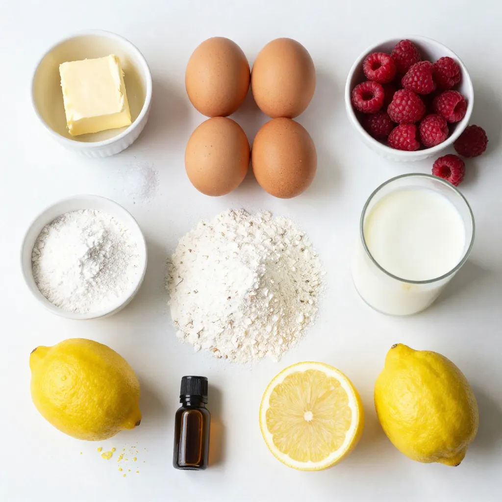 Each ingredient plays an important role. The butter gives richness, while the sugar adds sweetness. Eggs help bind everything together and make the cake fluffy. Flour provides structure, and baking powder helps it rise. The salt brings out the flavors. Whole milk adds moisture, and lemon zest and juice infuse a bright, tangy taste. Fresh raspberries add a burst of flavor and color.