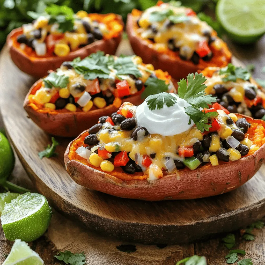 - 2 large sweet potatoes - 1 tablespoon olive oil - 1 teaspoon ground cumin - 1 teaspoon smoked paprika - Salt and black pepper to taste - 1 cup canned black beans, rinsed and drained - 1 cup corn kernels (can use frozen or fresh) - 1/2 cup red bell pepper, diced - 1/2 cup red onion, diced - 1 cup sharp cheddar cheese, shredded - 1/2 cup Greek yogurt or sour cream - Fresh cilantro, chopped, for garnish - Lime wedges, for serving Sweet potatoes give a sweet flavor and soft texture. You can use white potatoes if needed, but they change the taste. Olive oil adds richness, but you can use avocado oil as a swap. Ground cumin and smoked paprika create a warm and smoky taste. If you want heat, add chili powder instead. Black beans are great for protein. You can switch them for pinto beans or chickpeas. Corn adds sweetness and crunch. Frozen corn is just fine. Red bell pepper and onion offer color and zest. Yellow or green peppers can work too. Cheddar cheese makes this dish creamy. Try Mexican blend cheese or pepper jack for a twist. Greek yogurt or sour cream adds tang. You can skip this if you want a lighter version. - Sweet Potatoes: Look for organic options from your local market. - Olive Oil: I prefer California Olive Ranch for its flavor. - Canned Black Beans: Goya is a reliable choice for quality. - Corn Kernels: Del Monte offers great frozen corn. - Cheddar Cheese: Cabot Creamery has a sharp flavor that I love. - Greek Yogurt: Chobani is a trusted brand with a creamy texture. Start by preheating your oven to 400°F (200°C). Wash the sweet potatoes well. Use a fork to poke holes all over them. This helps steam escape. Place the sweet potatoes on a baking sheet lined with parchment paper. Bake them for about 45-50 minutes. They are done when a fork goes in easily. Let them cool for about 10 minutes after baking. Next, slice each sweet potato in half lengthwise. Carefully scoop out some of the flesh, leaving about a 1/4 inch on the skin. Keep the scooped-out sweet potato. You will use it for the filling. In a mixing bowl, combine the reserved sweet potato flesh with these ingredients: - 1 cup canned black beans, rinsed and drained - 1 cup corn kernels - 1/2 cup diced red bell pepper - 1/2 cup diced red onion - 1 tablespoon olive oil - 1 teaspoon ground cumin - 1 teaspoon smoked paprika - Salt and black pepper to taste Mix everything well until combined. This filling is packed with flavor and nutrients. Now, spoon the filling back into each sweet potato skin. Pack it in well to make it tasty. Sprinkle shredded cheddar cheese over the top of each potato half. Put the stuffed sweet potato skins back in the oven. Bake them for 15-20 minutes. You want the cheese to melt and bubble, creating a nice golden crust. After baking, let them cool for a few minutes. Top each skin with a dollop of Greek yogurt or sour cream. Add fresh cilantro for a burst of color. Serve with lime wedges on the side for extra zest. Enjoy your Loaded Southwest Sweet Potato Skins! To make great Loaded Southwest Sweet Potato Skins, start with the right sweet potatoes. Choose large, firm ones. Wash them well to remove dirt. Use a fork to poke holes all over. This step helps steam escape while baking. Bake them at 400°F for 45-50 minutes. They should be soft but not mushy. Let them cool for a few minutes before cutting. This makes them easier to handle. When scooping out the flesh, leave some on the skin. This gives your skins strength to hold the filling. Flavor is key in this dish. For the filling, mix the sweet potato flesh with black beans and corn. Add diced red bell pepper and red onion for crunch and color. Season with olive oil, cumin, and smoked paprika. These spices bring warmth and depth. Taste the mixture and adjust salt and pepper. You want each bite to burst with flavor. To finish, top with sharp cheddar cheese. It melts nicely and adds richness. Don't skip the Greek yogurt or sour cream on top. It adds creaminess and balances the spices. Presentation can elevate your dish. Serve the loaded sweet potato skins on a bright platter. This makes the colors pop. Drizzle extra Greek yogurt or sour cream on top. Add a sprinkle of fresh cilantro for a fresh touch. Place lime wedges around the platter for a zesty look. This also invites guests to squeeze lime over their skins. A beautiful presentation makes the dish more appealing, and it tastes even better! Enjoy your creation and share with friends! {{image_4}} To make your Loaded Southwest Sweet Potato Skins vegetarian or vegan, swap the cheese and yogurt. Use a plant-based cheese for that melty goodness. For the yogurt, try cashew cream or coconut yogurt. These options keep the dish creamy and delicious without dairy. You can still enjoy the rich flavors of cumin and smoked paprika. If you want to boost the protein in these sweet potato skins, consider adding cooked chicken, turkey, or tofu. Shredded rotisserie chicken works great and saves time. You can also add other veggies like zucchini or spinach. Simply chop them small and mix them in with the filling. This adds color and nutrients to your dish. Looking to spice things up? Change the seasoning to fit your taste. Try adding chili powder for heat or taco seasoning for a bold kick. You can also use fresh herbs like oregano or thyme for a different flavor. A squeeze of lime juice adds freshness and brightness to every bite. Explore different combinations to find your favorite! To keep your loaded southwest sweet potato skins fresh, store them in an airtight container. Place parchment paper between layers if stacking them. This keeps the skins from getting soggy. Store them in the fridge for up to three days. If you want to keep them longer, freezing is a good option. Reheat your sweet potato skins in the oven for the best taste. Preheat the oven to 350°F (175°C). Place the skins on a baking sheet lined with foil or parchment paper. Heat them for about 10-15 minutes or until they’re warm and the cheese is melte