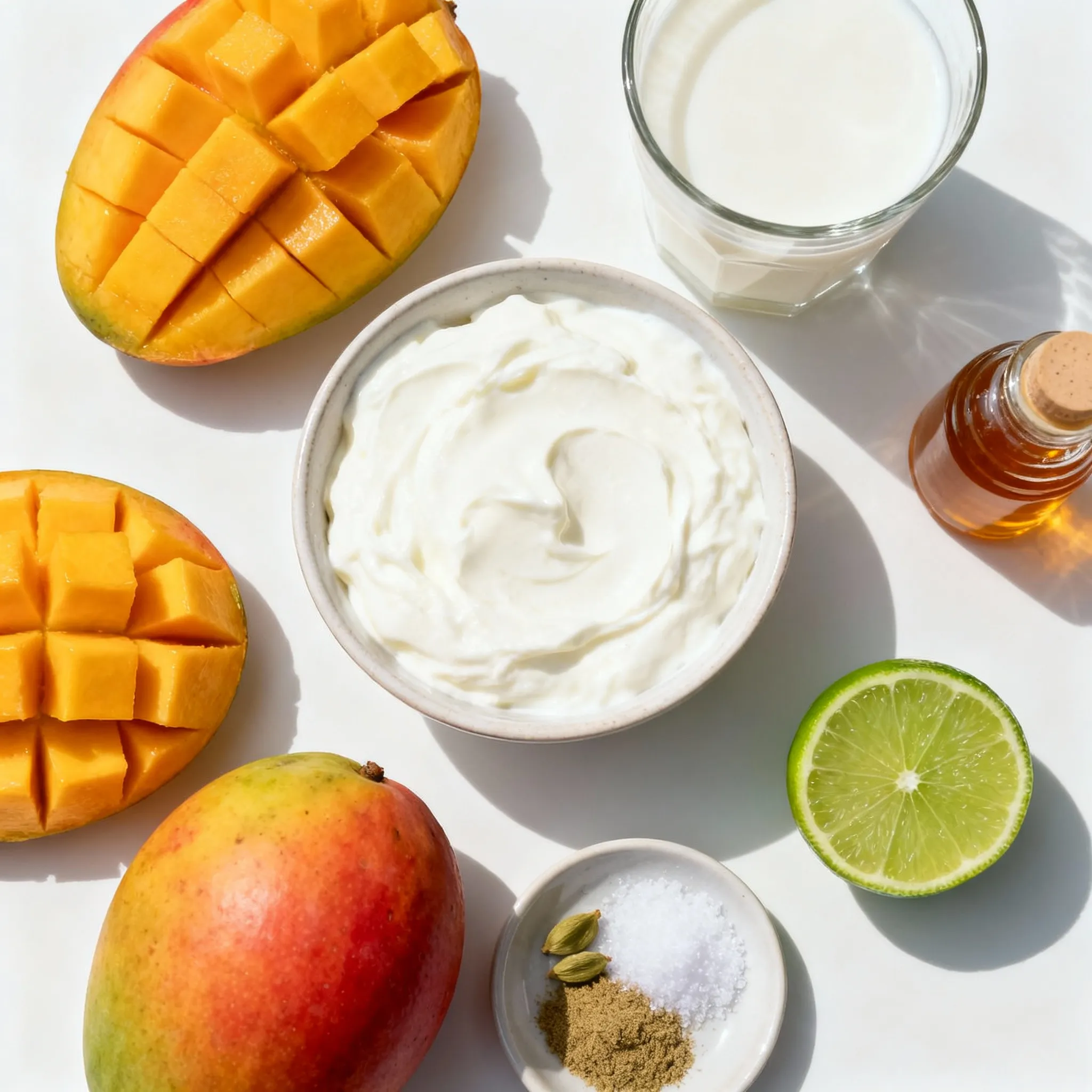 First, gather your ingredients. You need two ripe mangoes, yogurt, milk, honey, ground cardamom, lime juice, and salt.