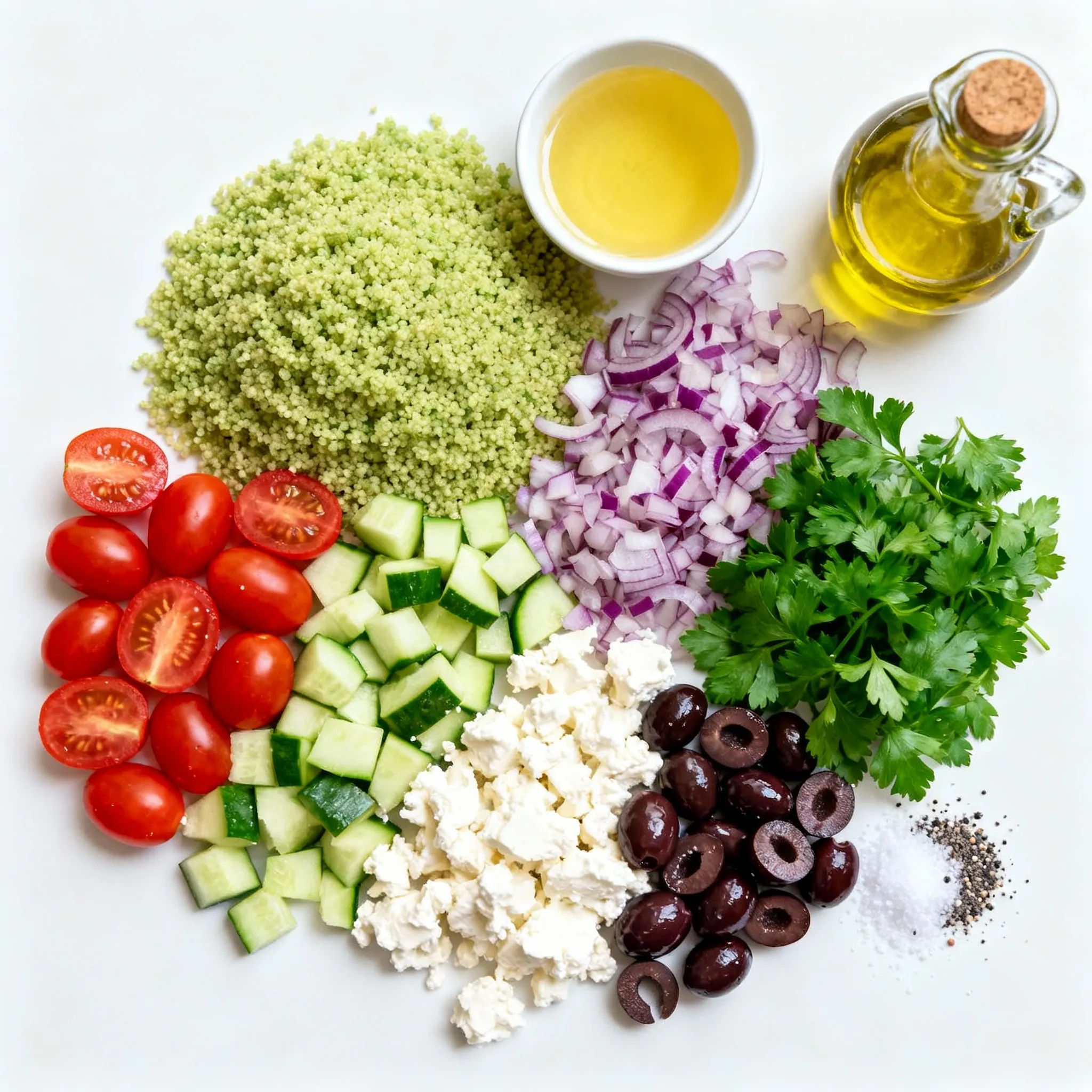 - Combine Vegetables: In a large bowl, mix 1 cup of halved cherry tomatoes, 1 medium diced cucumber, 1/2 finely chopped red onion, 1/2 cup sliced Kalamata olives, 1/2 cup crumbled feta cheese, and 1/4 cup chopped fresh parsley.