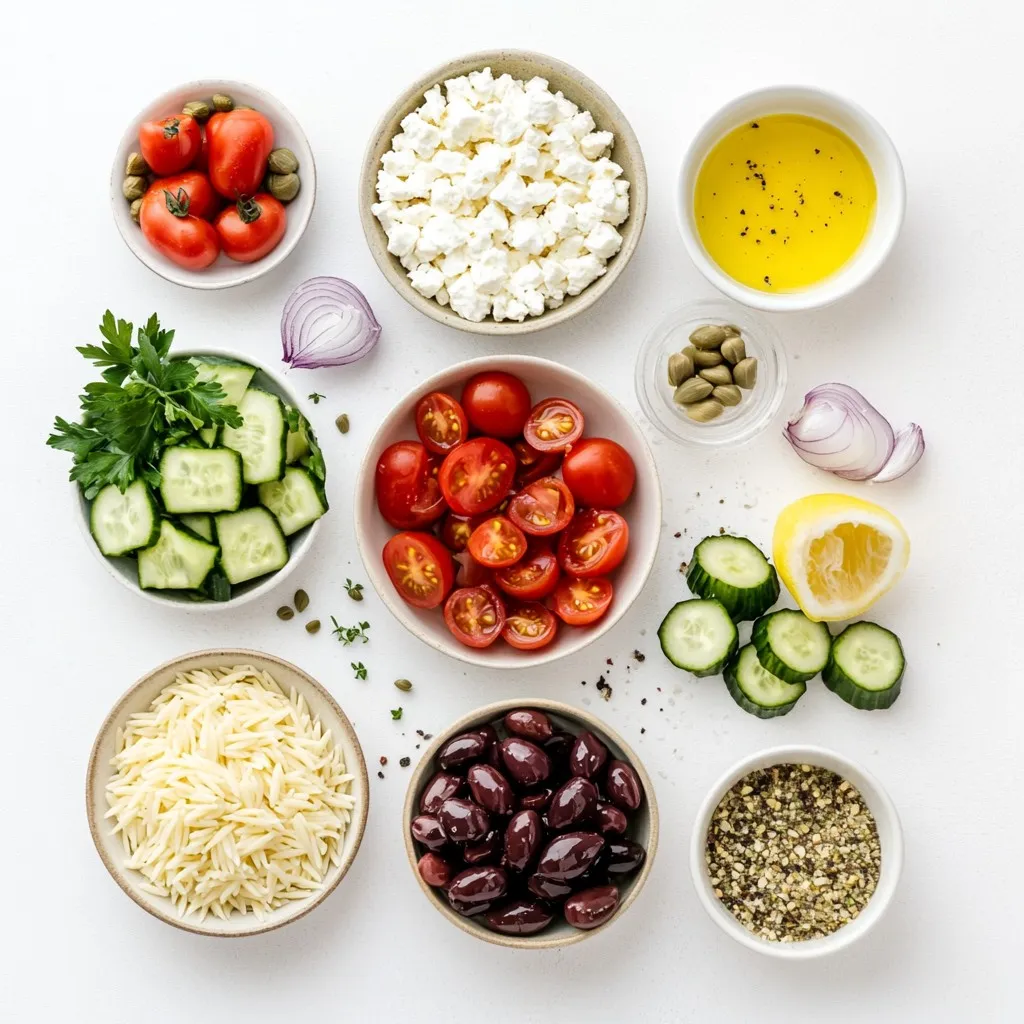 To make a tasty Mediterranean Orzo Salad, gather these ingredients: