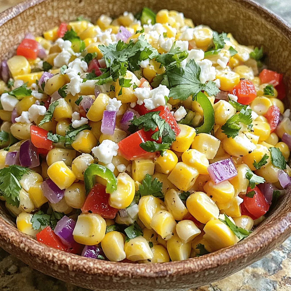 Fresh ingredients are key for flavor. Use ripe corn to get the best taste. Choose a red bell pepper that is firm and shiny. For a spicy kick, pick a fresh jalapeño. If you want a milder taste, remove the seeds before mincing. Red onion adds a nice crunch and sweetness. Feta cheese brings creaminess, while cilantro adds a fresh touch.