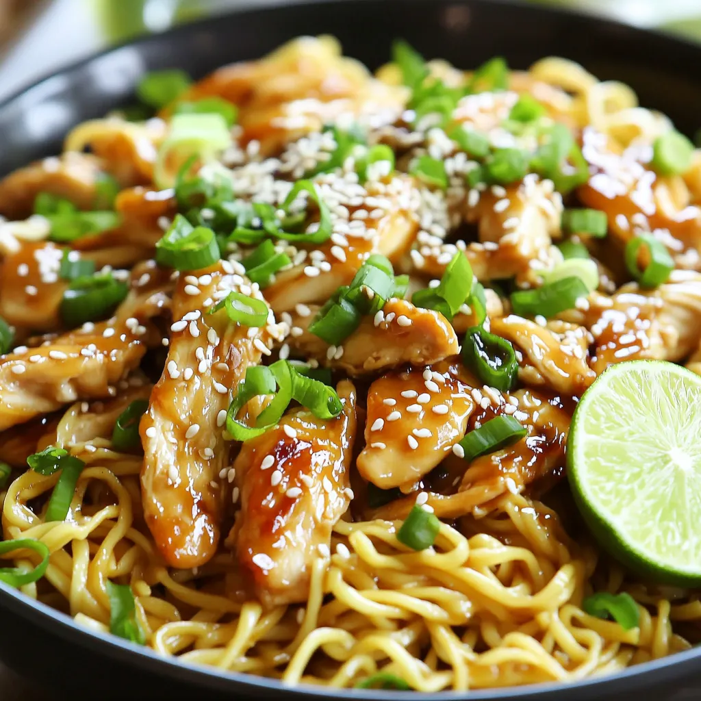 Before serving, add some finishing touches. Remove the skillet from heat. Sprinkle 2 thinly sliced green onions and 1 tablespoon of sesame seeds over the dish. If you like, add fresh cilantro or parsley for extra flavor. For presentation, serve the chicken and noodle mix in a large, shallow bowl. Garnish with more green onions and a sprinkle of sesame seeds. A lime wedge on the side adds a nice touch and a zesty kick!