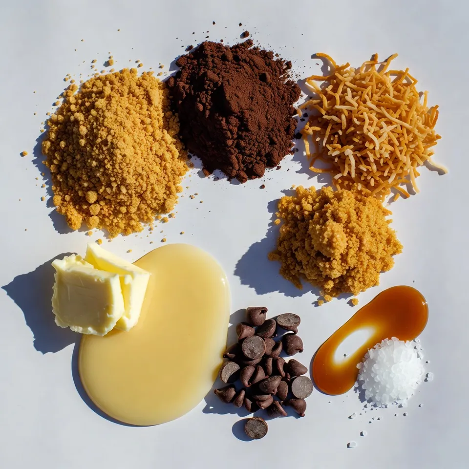 Next, brown sugar adds sweetness. Unsalted butter helps hold the base together. Sweetened condensed milk creates a creamy filling. Semi-sweet chocolate chips will be our topping. Caramel sauce gives a nice gooey texture. Lastly, vanilla extract adds depth to the flavor.