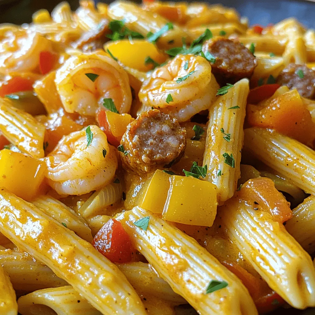 - 8 oz penne pasta - 1 lb shrimp, peeled and deveined - 8 oz smoked sausage, sliced into rounds - 1 bell pepper (red or yellow), finely chopped - 1 small onion, diced - 3 cloves garlic, minced - 2 cups chicken broth (low sodium recommended) - 1 cup heavy cream - 2 tablespoons Cajun seasoning - 1 tablespoon olive oil - Salt and black pepper, to taste - Fresh parsley, chopped - Lemon wedges Each ingredient plays a key role in this dish. The penne pasta provides a good base, while the shrimp adds a nice texture. The smoked sausage gives a rich, meaty flavor. Bell pepper and onion bring in sweetness, and garlic adds depth. For the sauce, chicken broth and heavy cream create a creamy texture. Cajun seasoning gives that unique, spicy kick. Olive oil helps with sautéing, while salt and pepper enhance all the flavors. You can garnish with fresh parsley for color and a touch of brightness. Lemon wedges add a zesty contrast and brighten the dish even more. Each element combines to create a delightful meal. To cook the penne pasta, fill a large pot with water. Add a generous pinch of salt. Bring the water to a rolling boil. Then, add the penne pasta and cook for about 9 to 11 minutes. This timing helps you reach that perfect al dente texture. Once cooked, drain the pasta and set it aside. In the same pot, add olive oil and heat it over medium heat. When the oil shimmers, add the sliced smoked sausage. Sauté the sausage for about 3 to 4 minutes. You want it nicely browned, as this adds great flavor. Once browned, use a slotted spoon to remove the sausage and set it aside. Keep using that same pot! Add the diced onion and chopped bell pepper. Sauté them for about 2 to 3 minutes until softened. Then, add the minced garlic. Cook for an additional minute, until the garlic smells great. This step builds a solid flavor base for your dish. Return the browned sausage to the pot. Now, add the peeled and deveined shrimp. Sprinkle the Cajun seasoning evenly over everything. Cook this mix for about 3 to 4 minutes. Toss gently until the shrimp turns opaque and is fully cooked. The Cajun seasoning brings that bold flavor to life. Pour in 2 cups of chicken broth and 1 cup of heavy cream. Stir well to mix all the ingredients. Increase the heat slightly and bring the mixture to a gentle simmer. This allows all the flavors to meld together beautifully. Now, add the cooked penne pasta back into the pot. Toss well to coat all the pasta in the creamy sauce. Let it simmer for an additional 2 to 3 minutes. This helps the flavors infuse into the pasta. Finally, taste your dish and adjust the salt and black pepper if needed. You can also tweak the Cajun seasoning for extra heat. Serve your one-pot Cajun shrimp and sausage pasta in warm bowls. Garnish each serving with freshly chopped parsley for a pop of color. Enjoy this delicious meal! - Adjusting Cajun seasoning: Start with the listed amount of Cajun seasoning. If you want more heat, add a bit more. Taste as you go, so you find your perfect blend. - Suggestions for additional spices: Try adding a pinch of smoked paprika for extra depth. A dash of cayenne pepper can also boost the heat if you like it spicy. - Importance of using the same pot: Using the same pot keeps all the flavors together. The bits left from the sausage make the dish richer. Each step builds on the last. - Benefits of one-pot cooking: One-pot meals save time and reduce cleanup. You’ll have fewer dishes to wash, and all the flavors meld perfectly together. It’s a win-win! - Serving suggestions: Serve the pasta in warm bowls. This keeps it hot longer and looks inviting. - Recommended plating techniques: Garnish each bowl with fresh parsley. A lemon wedge on the side adds color and a fun twist. It also brightens the dish with a zesty kick! {{image_4}} You can switch shrimp for chicken. Chicken thighs work well here. Cut them into bite-sized pieces. Cook them in the same way as the shrimp. They will soak up the Cajun flavors nicely. Using different types of sausage adds variety, too. Try andouille sausage for a spicier kick. Turkey sausage is a lean option if you want something lighter. Just slice them and sauté as the recipe says. For a vegetarian version, substitute shrimp and sausage with plant-based proteins. You can use tofu or tempeh. Both absorb flavors well and add protein. Enhance flavor in vegetarian versions by adding extra spices. Consider smoked paprika or a dash of liquid smoke. These can mimic the richness of sausage and shrimp. Fresh herbs like thyme or oregano also boost flavor. If you love heat, increase spice with additional Cajun seasoning. Add a teaspoon or two, based on your taste. Incorporating hot sauce or peppers can also spice things up. A few dashes of your favorite hot sauce will do. You can also add diced jalapeños for a fresh kick. Just be careful not to overpower the other flavors. To store leftovers of your One-Pot Cajun Shrimp and Sausage Pasta, first let it cool. Then, place it in an airtight container. This keeps air out and moisture in. The best containers are glass or BPA-free plastic. These materials help maintain flavor and texture. If you want to freeze this dish, first cool it completely. Then, portion it into freezer-safe bags. Remove as much air as possible before sealing. For reheating, thaw it in the fridge overnight. You can reheat it on the stove over low heat. Stir often to ensure even heating. Add a splash of broth or cream to revive the sauce. Generally, leftovers last about 3-4 days in the fridge. If frozen, they can last up to 3 months. For the best taste, eat it sooner rather than later. Always check for off smells or changes in texture before eating. Yes, you can prep this dish ahead. Cook the pasta and sausage in advance. Store them separately in the fridge. You can mix them with the sauce later. This way, the dish stays fresh and tasty. Tips for prep and cooking timeline: - Cook pasta and sausage a day before. - Chop vegetables ahead of time.