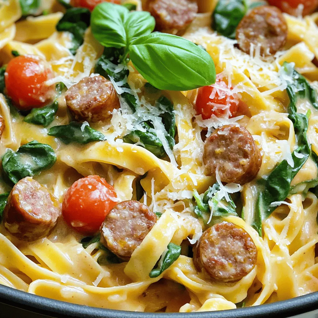 These ingredients come together to create a dish that’s rich and comforting. The Italian sausage adds a savory depth. The fettuccine pasta soaks up all the flavors, making every bite a delight. The heavy cream gives it a smooth texture. Baby spinach adds a pop of color and nutrition. Don’t forget the fresh basil for a bright finish!