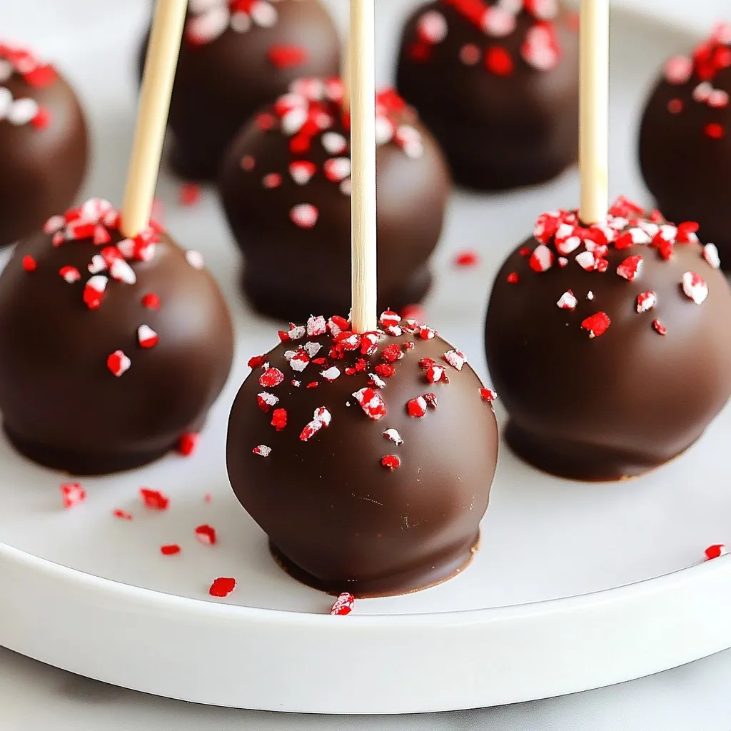 - 1 cup chocolate cake crumbs (from 1 baked chocolate cake) - 1/2 cup cream cheese, softened - 1/4 cup peppermint extract - 1 cup dark chocolate melting wafers - 1 tablespoon coconut oil - 1/2 cup crushed peppermint candies or candy canes - Lollipop sticks - Prep time: 30 minutes - Total time: 1 hour - Servings: 12 cake pops When I make peppermint chocolate cake pops, I start with these simple ingredients. I use chocolate cake crumbs from a freshly baked cake. The cream cheese helps bind everything together. It gives a nice texture and taste. The peppermint extract adds that refreshing flavor. I love using dark chocolate melting wafers; they create a smooth coat. Coconut oil makes the chocolate silky and easy to dip. For a festive touch, I crush peppermint candies or candy canes. They add crunch and color. Lollipop sticks hold it all together, making these treats fun to eat. With just 30 minutes for prep and 1 hour total, you can have 12 delicious cake pops ready to share. {{ingredient_image_2}} Start by taking a large bowl. Combine 1 cup of chocolate cake crumbs with 1/2 cup of softened cream cheese. Mix the two well. You want it to be smooth. When you press the mixture, it should hold its shape. This is crucial for forming the cake balls later. Next, add in 1/4 cup of peppermint extract. Mix until the extract is fully blended in. This step gives your cake pops that festive minty kick. Now, take small portions of the mixture. Roll each portion into a ball about 1 inch wide. Place these balls on a baking sheet lined with parchment paper. Once you have your cake balls, it’s time to freeze them. Place the baking sheet in the freezer for at least 30 minutes. Freezing helps the balls hold their shape when you dip them. While they freeze, prepare the chocolate. In a microwave-safe bowl, add 1 cup of dark chocolate melting wafers. Heat them for 30 seconds, then stir. Keep heating in 15-second bursts until melted and smooth. Add 1 tablespoon of coconut oil to the melted chocolate. This will give it a nice, glossy finish. Take the cake pops out of the freezer. Now, dip each one into the melted chocolate. Make sure it’s fully coated. Tap the stick against the bowl's edge to get rid of any extra chocolate. Before the chocolate sets, sprinkle crushed peppermint candies or candy canes on top. This adds a lovely crunch and color. Finally, place the cake pops upright in a foam block. Let them sit until the chocolate hardens completely. To make perfect cake balls, you need the right moisture balance. Combine your chocolate cake crumbs and cream cheese well. If the mixture feels dry, add a little cream cheese. If it’s too wet, add more cake crumbs. For rolling techniques, use clean hands to form uniform balls. Aim for about one inch in diameter. Make sure each ball holds its shape well. Place them on a baking sheet lined with parchment paper. This helps prevent sticking. Melting chocolate can be tricky. Use a microwave-safe bowl to melt your dark chocolate wafers. Heat them in the microwave for 30 seconds first. Then, stir the chocolate. Continue heating in 15-second intervals, stirring each time, until it’s smooth. To avoid clumps, add coconut oil to the melted chocolate. This keeps it silky and easy to coat your cake pops. Make sure to stir well after adding the oil. For creative displays, think outside the box. You can use a holiday-themed container or a stylish stand. This adds fun to your table. For additional garnishing options, drizzle melted chocolate over the tops of your cake pops. You can also sprinkle more crushed peppermint candies on top. This makes your treats look festive and inviting! Pro Tips Chill the Mixture: Ensure the cake mixture is sufficiently chilled before rolling into balls. This helps maintain their shape and makes them easier to work with. Use Quality Chocolate: Opt for high-quality dark chocolate melts for better flavor and a smoother coating. This will elevate the taste of your cake pops. Stabilize the Sticks: To prevent the lollipop sticks from slipping out, dip the end of each stick in the melted chocolate before inserting it into the cake ball. Decorate with Care: Add the crushed peppermint immediately after dipping to ensure they stick well to the chocolate coating before it sets. {{image_4}} You can easily make these cake pops vegan. Just swap the cream cheese with a plant-based cream cheese. Use vegan chocolate melting wafers instead of regular chocolate. This way, you keep the same great taste while sticking to plant-based ingredients. If you need a gluten-free version, choose gluten-free chocolate cake mix. Make sure to check labels for hidden gluten in other ingredients. You can also use gluten-free oats processed into fine crumbs to create the cake base. This keeps the texture light and fun. Want to change things up? Try different extracts like almond or vanilla. You can also use white chocolate melting wafers for a different taste. Adding a bit of orange zest can bring a fresh twist to your cake pops. Feel free to explore what flavors make you smile! To keep your peppermint chocolate cake pops fresh, use airtight containers. A cake pop holder works well too. Make sure the pops are cool before placing them inside. Avoid stacking the pops to prevent damage. When stored properly, cake pops can last up to one week in the fridge. For longer storage, freeze them. They will stay good for about three months in the freezer. Just make sure to wrap each pop in plastic wrap before freezing. To thaw frozen cake pops, remove them from the freezer and take off the plastic wrap. Place them in the fridge for about an hour. This slow thaw helps keep the texture nice. If you’re in a hurry, you can let them sit at room temperature for about 30 minutes. Enjoy your sweet treats! Yes, you can use store-bought chocolate cake. Just crumble it into fine pieces. This saves time and effort. Tips for using pre-made cake: - Choose a moist cake for best results. - Avoid cakes with 