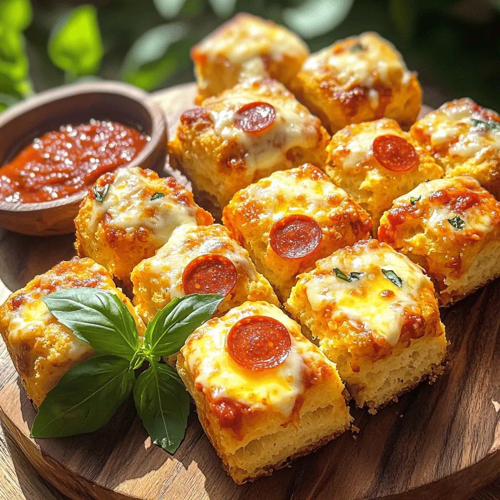 Cooking is all about the right ingredients. For this tasty Pepperoni Pizza Monkey Bread, you’ll need: - 3 cups refrigerated biscuit dough, cut into quarters - 1 cup pepperoni slices, chopped - 1 cup shredded mozzarella cheese - 1/2 cup grated Parmesan cheese - 1/4 cup pizza sauce (plus extra for dipping) - 2 teaspoons Italian seasoning - 1 teaspoon garlic powder - 1/4 cup unsalted butter, melted - 1/4 teaspoon red pepper flakes (optional) - Fresh basil leaves for garnish (optional) These simple items come together to create a fun and delicious dish. The refrigerated biscuit dough is perfect for quick prep. The pepperoni gives it that classic pizza flavor, while the cheeses add richness. Pizza sauce ties everything together with its zesty taste. Italian seasoning and garlic powder boost the flavor, making every bite delightful. If you like some heat, add red pepper flakes. The melted butter helps the monkey bread get that golden crust. Finally, fresh basil leaves not only look pretty but add a fresh kick. With these ingredients, you’re set for a fun cooking adventure. Enjoy making this dish with your family or friends! First, preheat your oven to 350°F (175°C). This step is key for even baking. While your oven heats, grab your bundt pan. Spray it well with non-stick cooking spray. This helps the monkey bread come out easily later. In a large bowl, take the biscuit dough and cut it into quarters. Then, add the chopped pepperoni. Use your hands to mix them together gently. You want the dough to be coated in pepperoni. Next, add the shredded mozzarella cheese and grated Parmesan cheese. Pour in the pizza sauce, Italian seasoning, and garlic powder. Mix well until everything is combined. If you like heat, toss in red pepper flakes and stir again. Now, pour the melted butter into the bottom of your greased bundt pan. This adds flavor and helps with removal. Spoon half of your biscuit mixture into the pan. Spread it out evenly. Then, layer the rest of the mixture on top. Press it down gently to pack it in. Place the bundt pan in your preheated oven and bake for 25-30 minutes. Look for a golden brown top. A toothpick should come out clean when inserted in the center. Once done, let it cool in the pan for about 10 minutes. Then, carefully flip it onto a serving platter. Enjoy your warm monkey bread with extra pizza sauce for dipping! To get the best bake, keep these tips in mind: - Use a bundt pan: This shape helps heat circulate, cooking evenly. - Do not overpack: Gently layer the dough in the pan. Too much pressure will make it dense. - Check early: Start checking at 25 minutes to avoid overbaking. You want it golden brown. Add fun twists to your monkey bread: - Spice it up: Add crushed red pepper or Italian herbs for extra flavor. - Toppings: Try olives, bell peppers, or cooked sausage. They add crunch and taste. - Dips: Pair with ranch, marinara, or garlic butter for fun dipping options. Make your dish shine when serving: - Presentation: Invert the bundt pan onto a plate. The shape is fun and inviting. - Garnish: Add fresh basil leaves on top for color and flavor. - Complete the meal: Serve with a salad or some garlic bread for a hearty dinner. {{image_4}} You can easily make this dish meat-free. Just swap the pepperoni for your favorite veggies. Think bell peppers, mushrooms, or spinach. These add color and taste. You can also play with cheeses. Try using cheddar or feta for a new flavor twist. Get creative with your toppings. You can add olives, cooked sausage, or even pineapple. Each option gives a unique taste. Customizing your spice blend is fun too. Mix in some oregano or crushed red pepper for extra zing. Make mini versions for kids. Use a muffin tin to bake smaller bites. They are perfect for little hands. Adjust spice levels for younger eaters. Skip the red pepper flakes if your kids prefer milder flavors. To keep leftover monkey bread fresh, first let it cool. Wrap it tightly in plastic wrap or foil. Store it in an airtight container. This keeps it safe from air and moisture. You can also place it in the fridge for up to three days. For best flavor, eat it fresh. When you want to enjoy your monkey bread again, you have two good options for reheating: the oven or the microwave. - Oven Method: Preheat your oven to 350°F (175°C). Place the monkey bread on a baking sheet and cover it with foil. Heat for about 10-15 minutes. This helps keep the outside crispy and the inside warm. - Microwave Method: Place a slice on a microwave-safe plate. Heat for about 30 seconds. This method is fast but may make it a bit softer. To keep the texture, reheating in the oven is best. You can freeze monkey bread before or after baking. If you want to freeze it raw, assemble it in the bundt pan but don’t bake it. Wrap the pan tightly in plastic. Place it in the freezer for up to a month. When ready to bake, let it thaw in the fridge overnight. Then, bake as normal. If you freeze it after baking, cool it down first. Wrap it well and store it in an airtight container. Thaw it in the fridge before reheating. Enjoy the same great taste! Pepperoni Pizza Monkey Bread can last up to three days when stored properly. Keep it in an airtight container at room temperature for the best taste. You can also refrigerate it to extend its shelf life. Just make sure to reheat it well before serving. Yes, you can use homemade biscuit dough! It adds a nice touch to the dish. Just make sure your dough is soft and easy to work with. The flavor of homemade dough can enhance the taste of the monkey bread. Experiment with your favorite recipes to find the best fit. Absolutely! You can use gluten-free biscuit dough for this recipe. Brands like Bob's Red Mill and Pillsbury offer good options. Just check the packaging for instructions. You can also try almond flour or chickpea flour mixes. These choices can keep the dish tasty while being gluten-free. This blog post shared how to create delicious Pepperoni Pizza Monkey Bread.