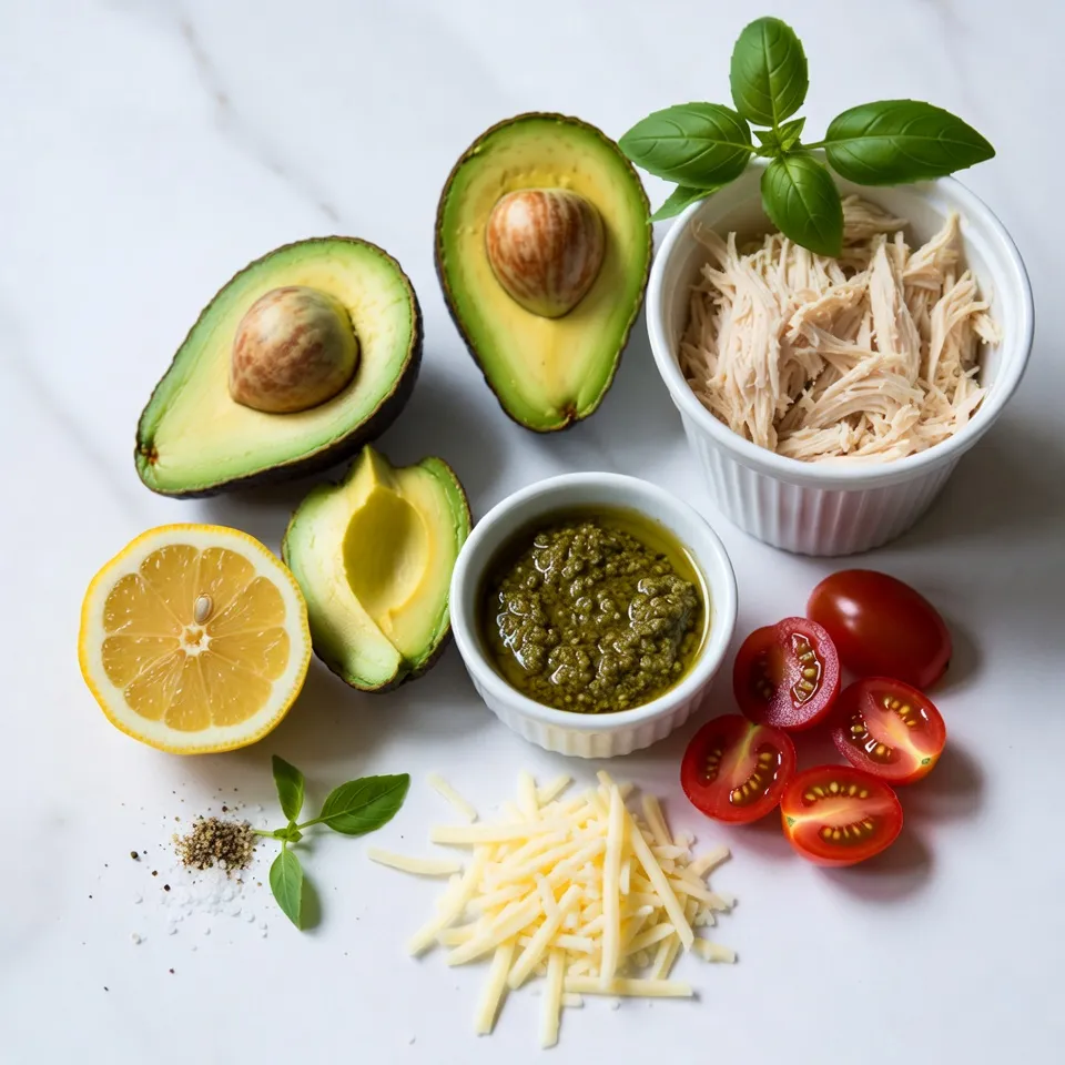 This ingredient list gives you all you need for a tasty meal. Each component plays a role in making the pesto chicken stuffed avocados delicious and appealing.